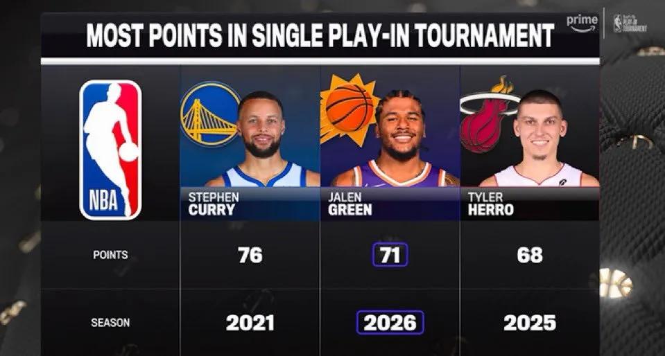 Jalen Green contributed a total of 71 points, 11 rebounds, and 6 assists across the two playoff qualification games, ultimately leading the Suns to advance to the playoffs as the eighth seed in the Western Conference, where they will face the Thunder, who are ranked first in the Western Conference and the league.