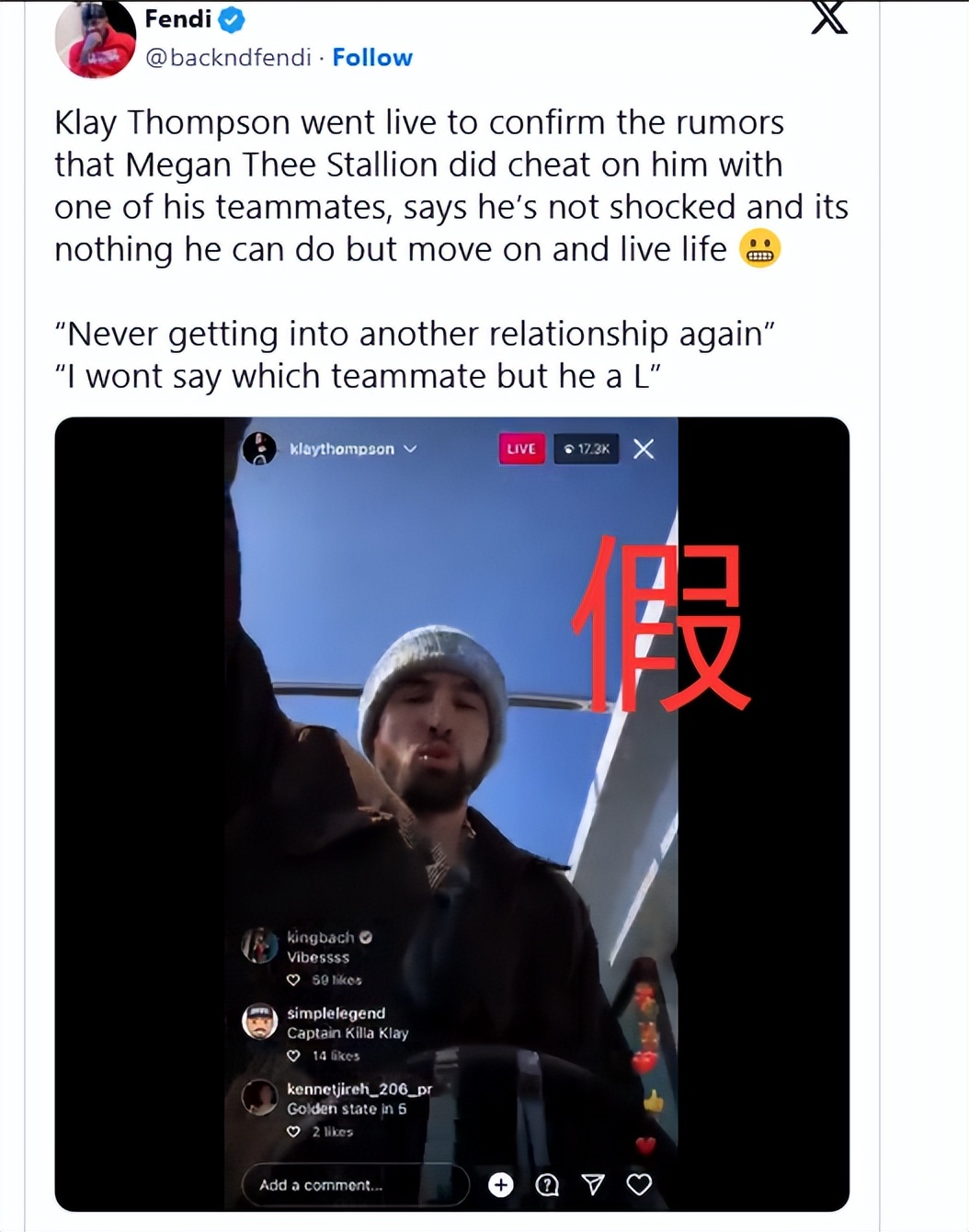 The account falsely captioned: "Clay Thompson went live confirming the rumors, stating Megan indeed cheated with one of his teammates. He said he wasn't surprised, couldn't do anything about it, and had to let go of the past and move on..."