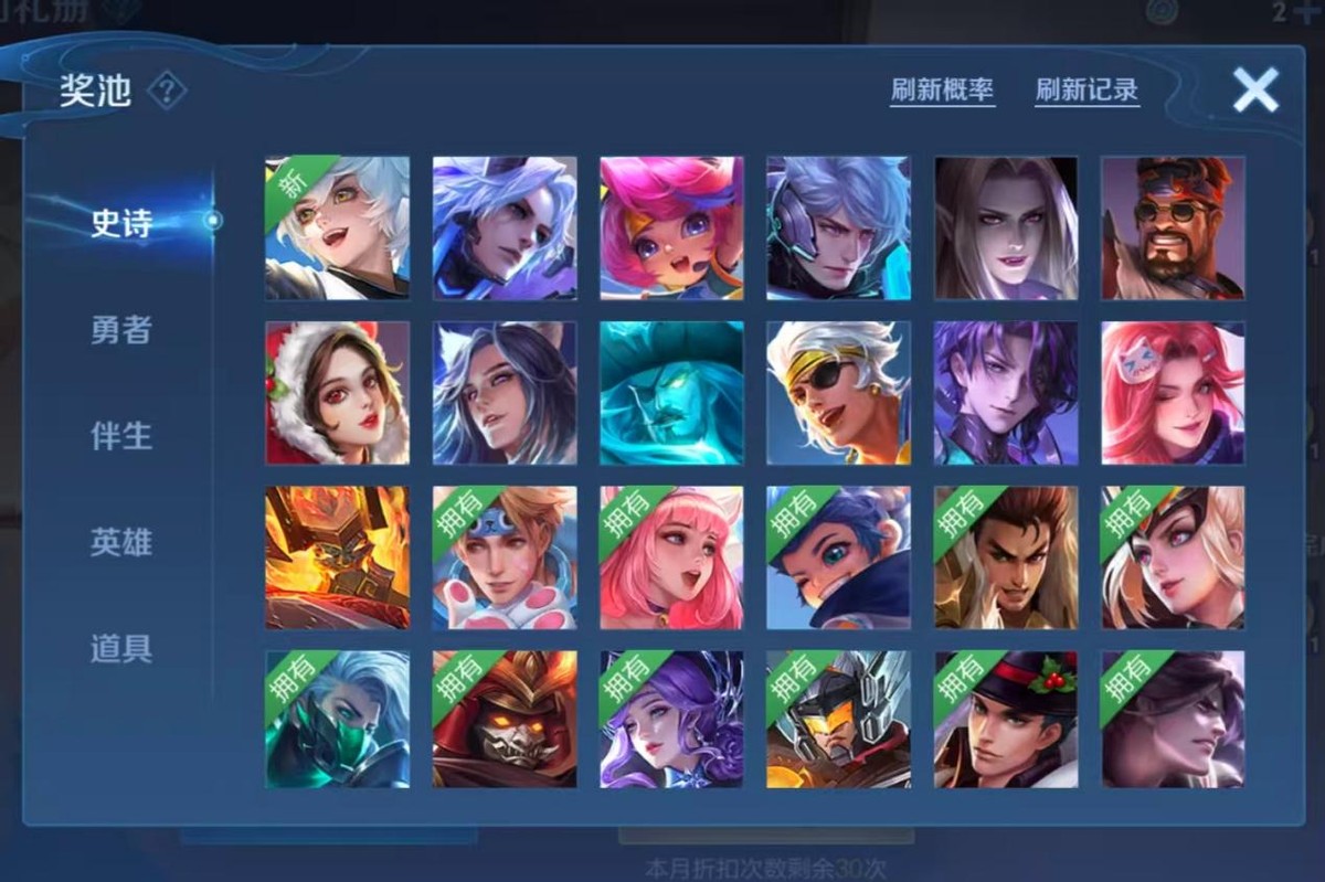First, the prize pool still includes epic and champion skins, but it’s no longer separated into different pools; instead, they are combined together. Players earn free refresh tokens by completing tasks such as logging in, playing matches, and getting kills or assists, which they can use to refresh the rewards in the pool. The first 40 refreshes each cost 1 free token, while subsequent refreshes require 2 tokens each.