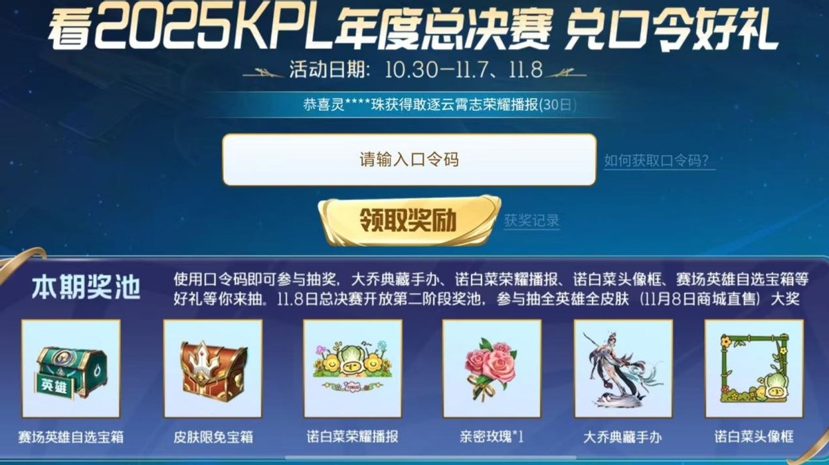 The second phase starts on November 8. You can reuse the same password codes from phase one, but the prize pool has been upgraded. It now includes exquisite rewards like Gan Jiang Mo Ye’s Eternal Victory God of War skin and Jiu Cheng’s animated signature. Most importantly, there will be a full hero and skin chest sold directly in the store on November 8. What does that mean? It means all heroes and skins available in the store on November 8 will be given away, but the chance is extremely slim—only 0.05%, and there is only one winner. Most players will just be part of the probability pool. Also, note that this reward will only be given between 19:00 and 20:30, so players aiming for it must enter the password code during this time frame.