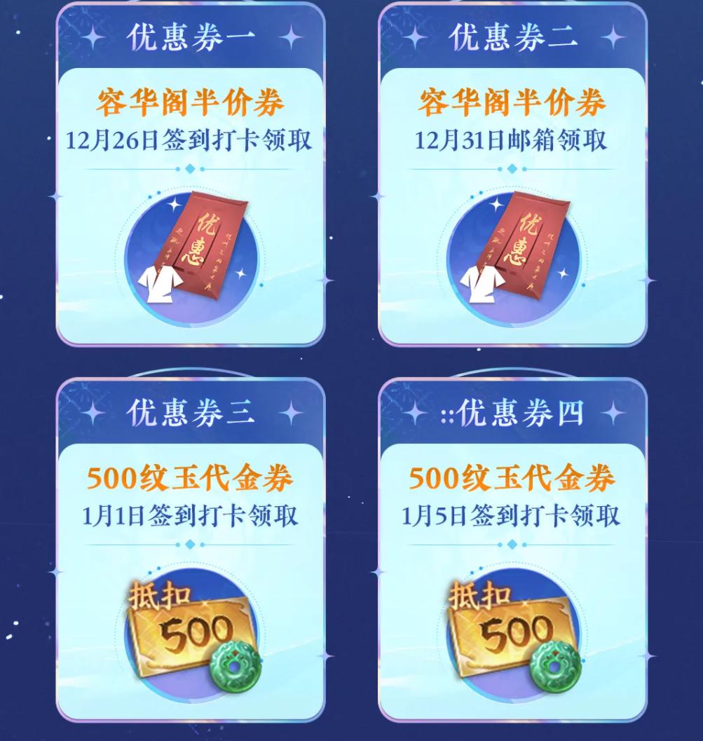 These include two free costume sets, numerous free mounts and accessories, plus over ten half-price costume coupons, jade voucher discounts, and other gifts—all designed so players can enjoy themselves fully both on stage and in-game!