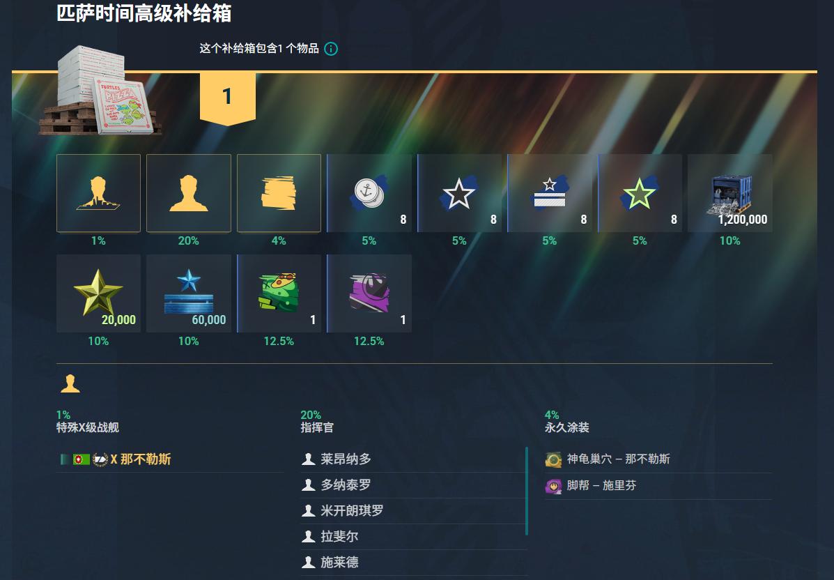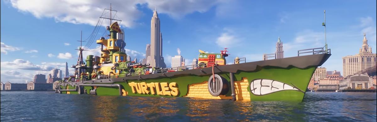 Two ships feature these crossover skins: the classic coal-powered cruiser Naples, whose commanders are the four main characters; and the Tier 10 D-class battlecruiser Schlieffen, commanded by the villain Shredder.