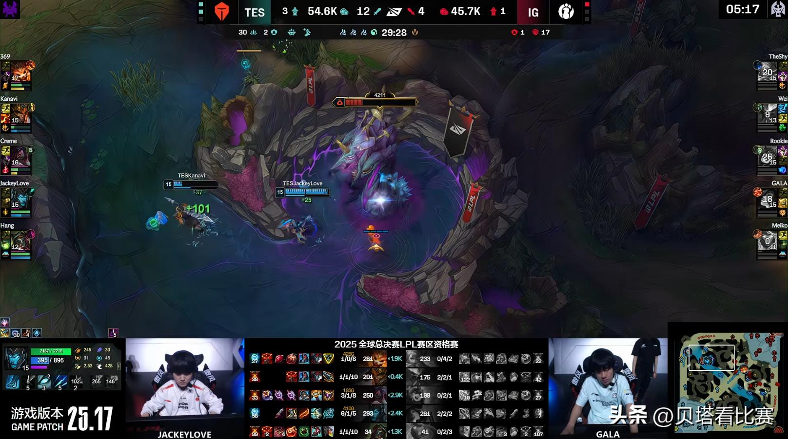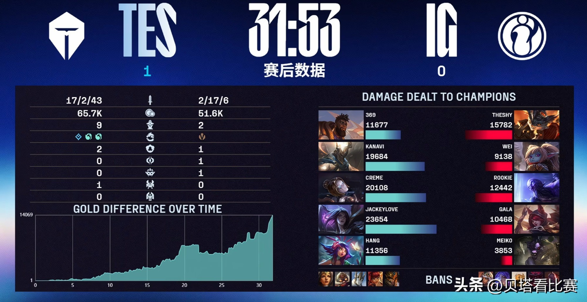 In the mid-game, both sides contested the Elder Dragon, with Wei's Poppy securing it. At 27 minutes, Hang’s Neeko was caught in the jungle, but TES's timely support turned the fight, achieving a 0-for-2 exchange and securing the first Baron. Later, at 31 minutes, TES pushed the bot lane, Hang’s Neeko ulted four enemies, and TES wiped IG to claim the first game victory. JKL’s Kai'Sa dealt the highest damage in this match.
