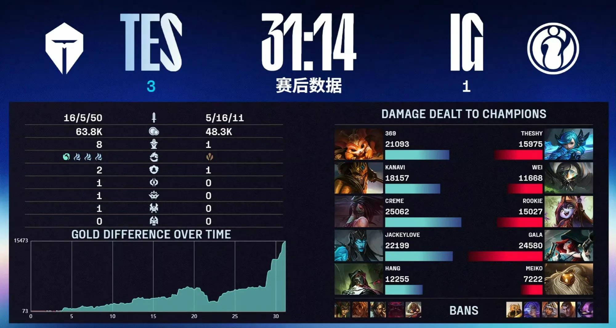 Watching the whole match, IG showed many problems and seemed unprepared. Mid laner Rookie completely became the weak link with no notable plays. Even Ning acknowledged that the biggest issue losing to TES was the “rookie,” followed by the coaching staff’s lineup and draft decisions. It felt like Rookie had no champion mastery during playoffs and play-ins. For example, in one top-lane moment, his fluid dodging left him burning his flash unnecessarily. Unless something unexpected happens, IG seems destined to be a ticket-seller—losing to BLG, AL, TES, and another competing team.