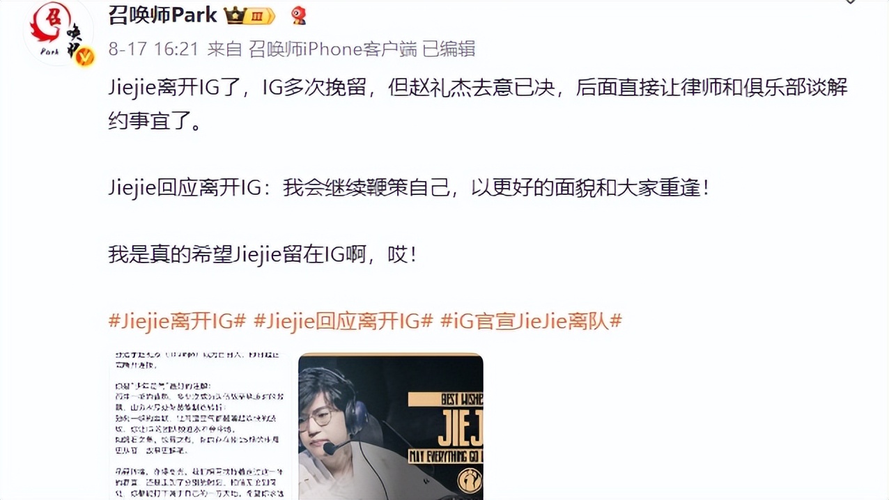 Jiejie played two splits with IG, helping the team earn some Worlds points. But in the third split, management suddenly signed a new jungler, aiming to rotate players like BLG. If it had been an unknown player, Jiejie might have accepted it, since IG has unparalleled attention in the LPL and performing well would bring fame. But Jiejie is a world champion jungler, and not even securing a starting spot was something he was willing to accept.