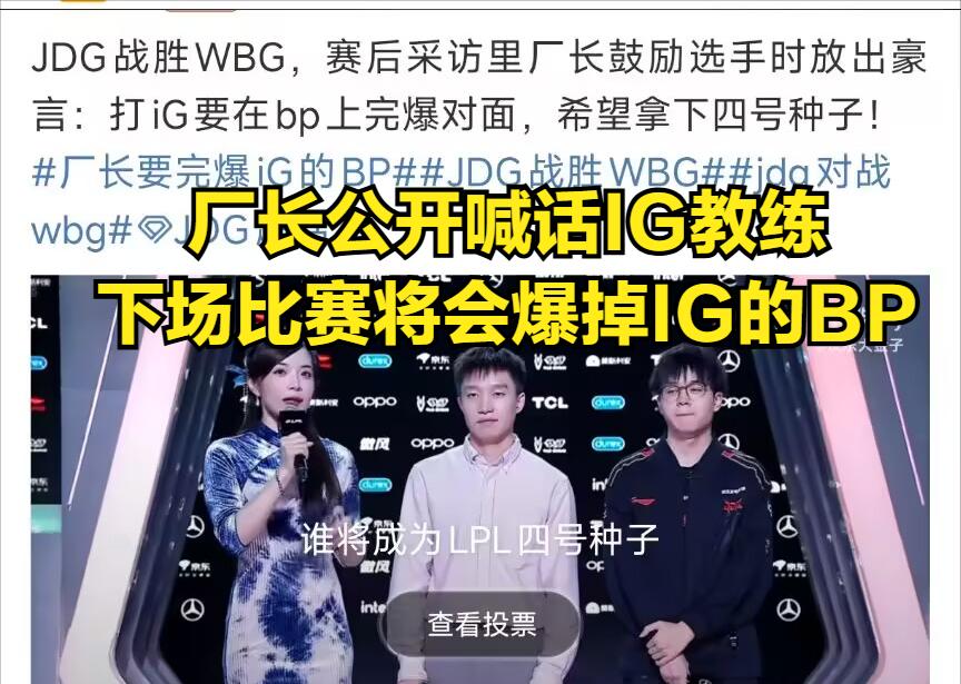 After JDG successfully advanced to the next round of the play-in stage, JDG's coach, the team captain, gave a post-match interview where he openly addressed IG's coach Dan Shen. The captain stated that in the upcoming match, JDG’s ban-pick strategy would absolutely crush IG. This statement sparked jokes among many LPL viewers, suggesting the captain is already studying their opponents for Worlds. (IG’s ban-pick in both playoffs and play-ins has been quite unpredictable, so the captain’s confident callout to Dan Shen makes sense. However, JDG hasn’t beaten TheShy in recent years, so it remains to be seen if the captain can make history.)