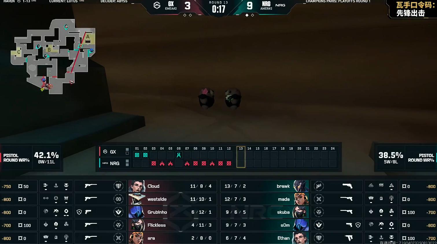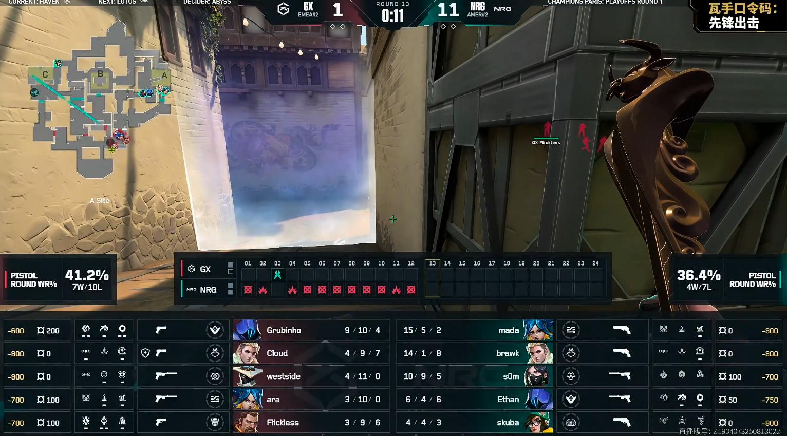 In the first half, NRG took the pistol round; in round 3, GX retook site C using coordinated utility to win the defense. Round 4 saw NRG rush quickly to site C and secure the round; after two GX players inside the site were eliminated, they opted to save their weapons. NRG then went on a three-round winning streak. In round 7, ara’s Cypher held A short for the first kill, but the defense still couldn’t hold. NRG built a huge lead with 11 points in the first half, while GX managed only 1 point.