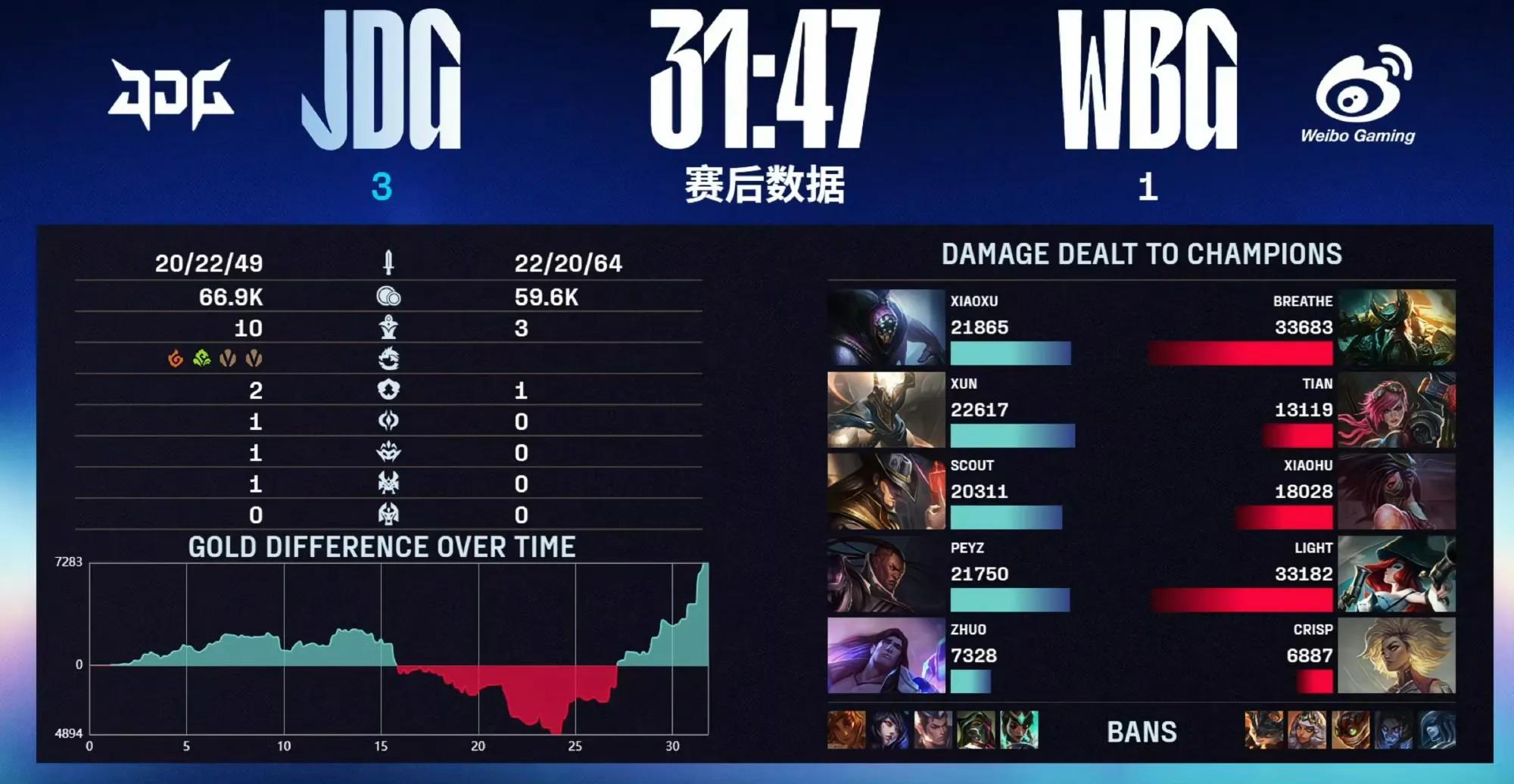 In the third game, WBG steadied their position. Xiaotian fought hard to secure Rift Herald at 21 minutes, then took Dragon at 25 minutes. At 28 minutes, Light’s Little Dragon output peaked with a pentakill, helping WBG turn the tide. The critical fourth game saw JDG repeatedly targeting Light early on, allowing WBG’s top and jungle to develop well. However, JDG secured jungle objectives in the Dragon and Rift Herald fights. The key turnaround was at 25 minutes when Xun’s ultimate caught a low-health Xiaohu, converting a one-for-three trade and securing Baron. The 1000 gold bounty helped Xun earn MVP for all three games.