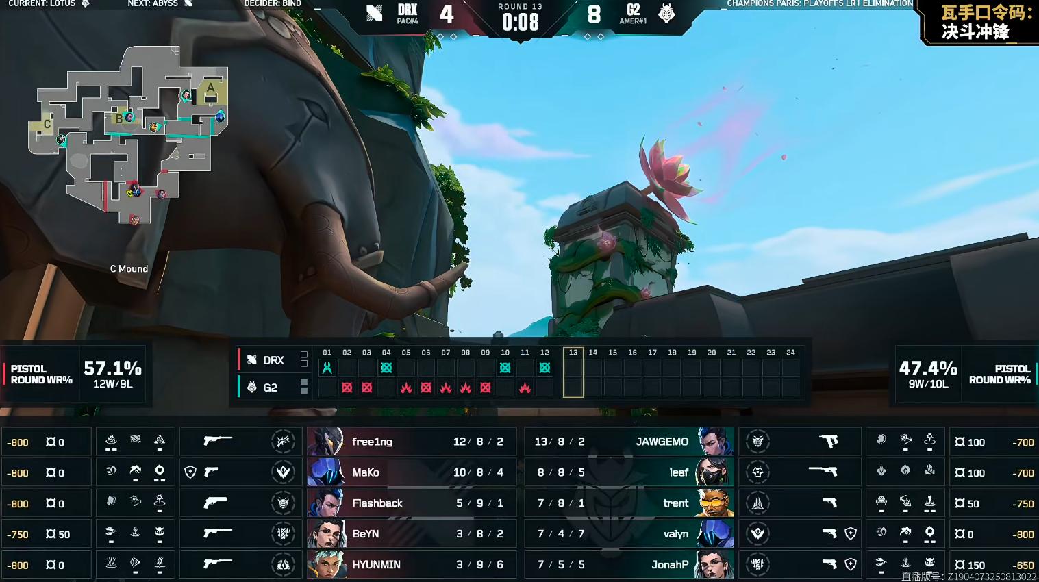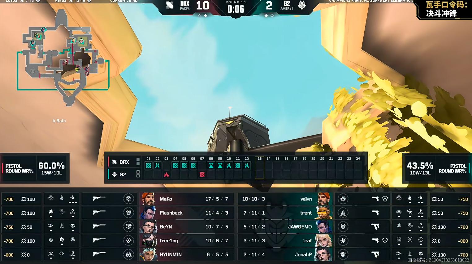 In the first half, DRX won the pistol round and started strong by breaking through G2’s defense to gain five rounds. G2 only managed to win the bonus round, suffering economic collapse throughout. G2’s timeout did not improve their situation, while DRX went on a six-round winning streak. In round 10, G2 rotated to defend site B, where valyn’s triple kill helped secure their second point. G2 then scored three consecutive rounds, closing the half at 8-4 in favor of DRX.