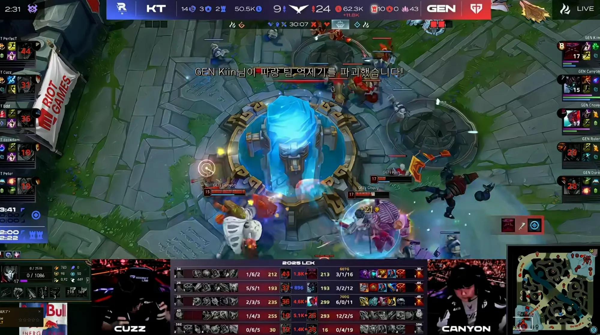 The match against GEN was highly anticipated by fans since KT had secured their Worlds spot by defeating GEN in the previous encounter. In the first game, KT got first blood within five minutes. Both teams played safe early to farm and exchange gold. At 26 minutes, GEN executed a top-tier dragon fight, exchanging zero deaths for three kills and opening a gold lead. BDD’s Annie flashing into the wall was captured on video. Eventually, GEN comfortably won the first game at 33 minutes. The second game followed LCK’s usual farming style, with first blood only appearing at nine minutes. Subsequent team fights felt like playing against bots, as GEN repeatedly secured zero deaths for two or four kills. Akali, with ultimate ready, dove tower to kill a low-health Taliyah but missed her abilities badly, allowing Taliyah to counter-kill under the tower. The second game ended quickly at 28 minutes.