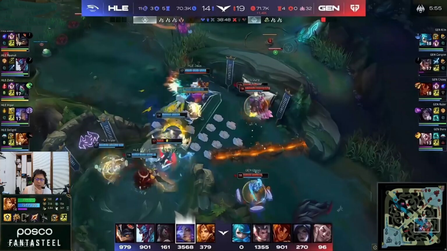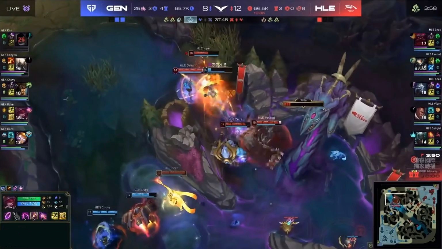 GEN won a team fight 1 for 4, securing both the dragon and Herald. With both carries ahead in farm, HLE had no chance in team fights. The second game was unfortunate for HLE; Zeus dominated top early, and mid-game team fights helped them claw back some ground. Both teams dragged the game on, but near the 40-minute mark in the late game, Peanut’s successful smite steal in the dragon soul fight led to the death of the third uncle first. Hanwha was at a 5v4 disadvantage, and that fight was winnable.