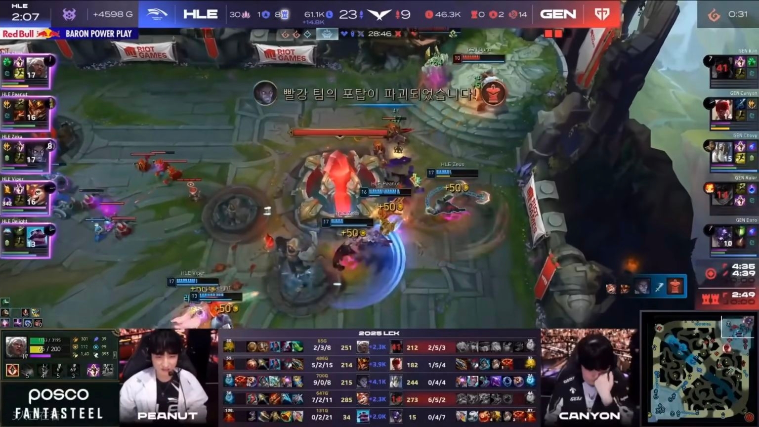 The result was as expected; the two teams played only four games, with GEN easily defeating HLE 3-1 to claim the annual championship. Reviewing this BO5, we can see how HLE lost: in the first game, Hanwha had an advantageous start, with Peanut ganking bot then mid, helping both carries secure kills. The team fights were evenly matched, and the economy remained balanced until the third dragon, where HLE ran into trouble.