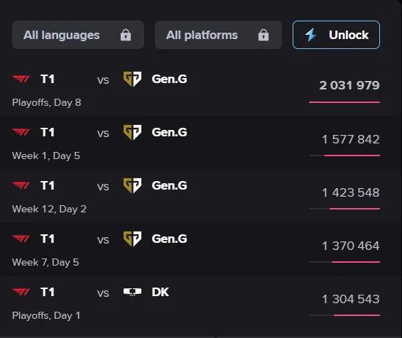 Most players are quite familiar with the T1 team. As a top-tier squad from the LCK region, their achievements in recent years have been outstanding. They have reached the World Championship finals for three consecutive years and won the championship twice in a row, consistently ranking among the world's best. Their popularity and hype are also at the top. According to viewership data released by the LCK region, it’s clear how dominant T1 is. All of the top five hottest teams in LCK this season are T1-related matchups: the top four are against Gen.G, and the fifth is against DK, leaving no room for other teams.