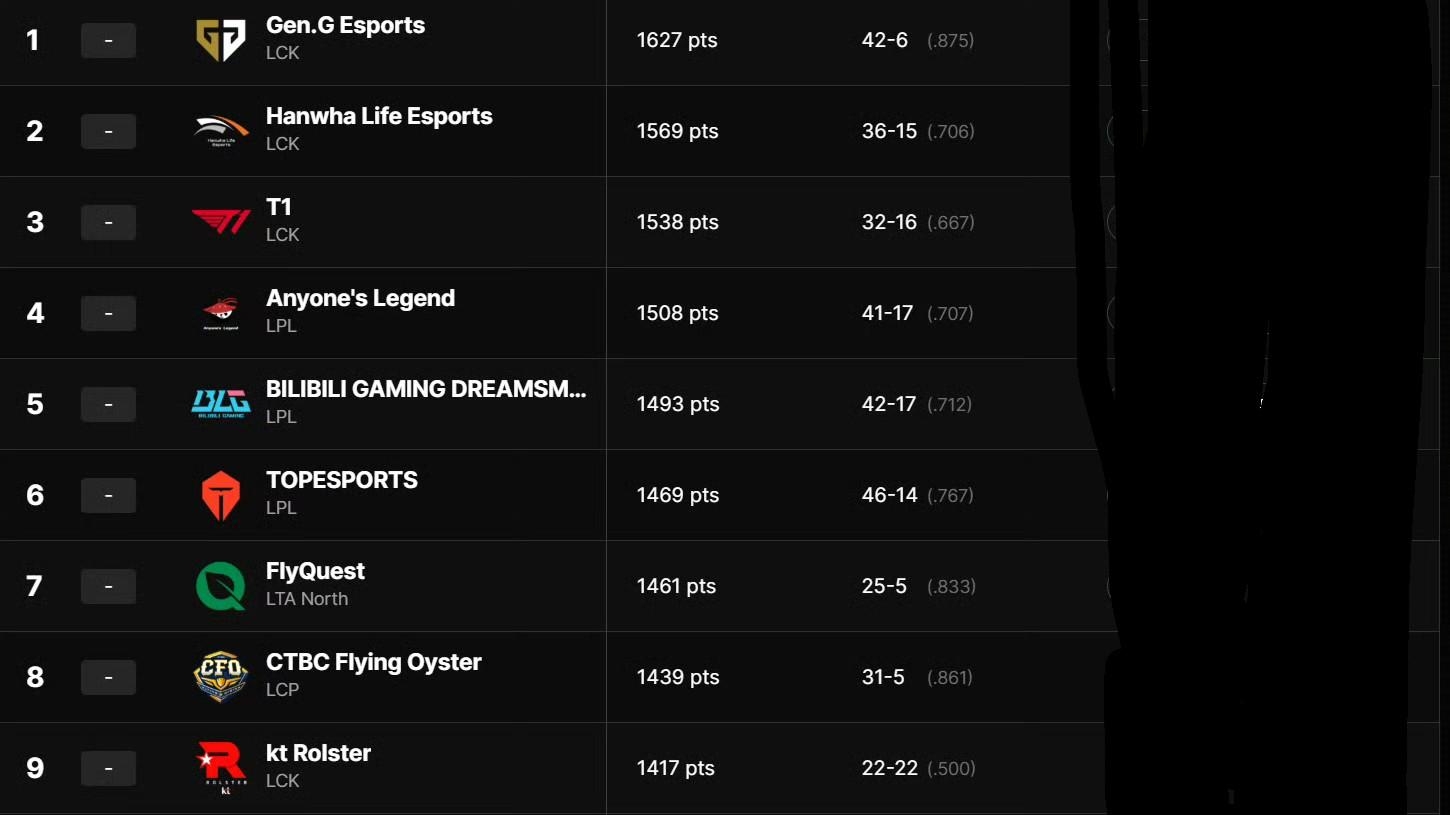 Recently, Riot updated their global team power rankings. LCK’s GEN, HLE, and T1 occupy the top three spots, while LPL’s AL, BLG, and TES hold fourth through sixth. The seventh to tenth places are taken by FLY, CFO, KT, and G2 respectively. Our region’s fourth seed, IG, didn’t even make the top ten. However, this ranking is mostly for fun, as Riot calculates it automatically based on wins and losses.