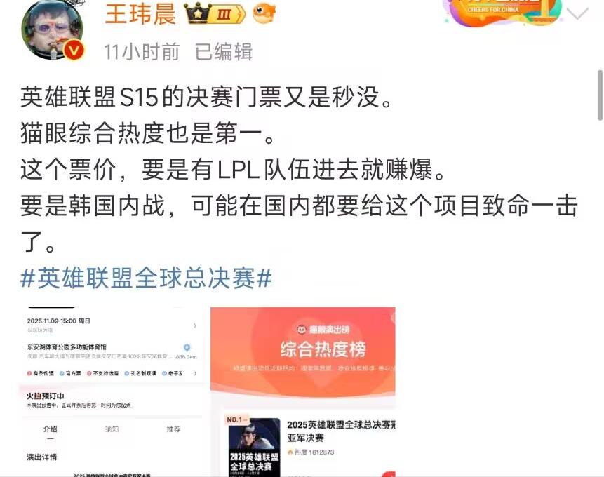 Many well-known LOL bloggers and streamers publicly complained that the S15 finals tickets were extremely hard to obtain. Some insiders even revealed that the difficulty of getting S15 finals tickets was comparable to that of the IG play-in tickets. Meanwhile, LPL official caster Wang Duoduo also posted, stating there are no internal channels to acquire S15 finals tickets and urged fans not to ask streamers via private messages. Additionally, some viewers speculated that if the finals were to be contested between two LCK teams, it could mean the end of LPL’s dominance.