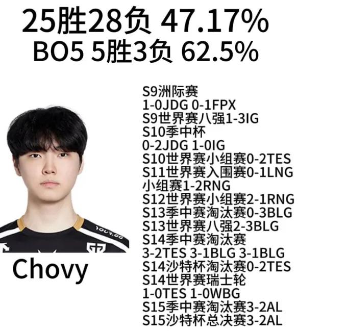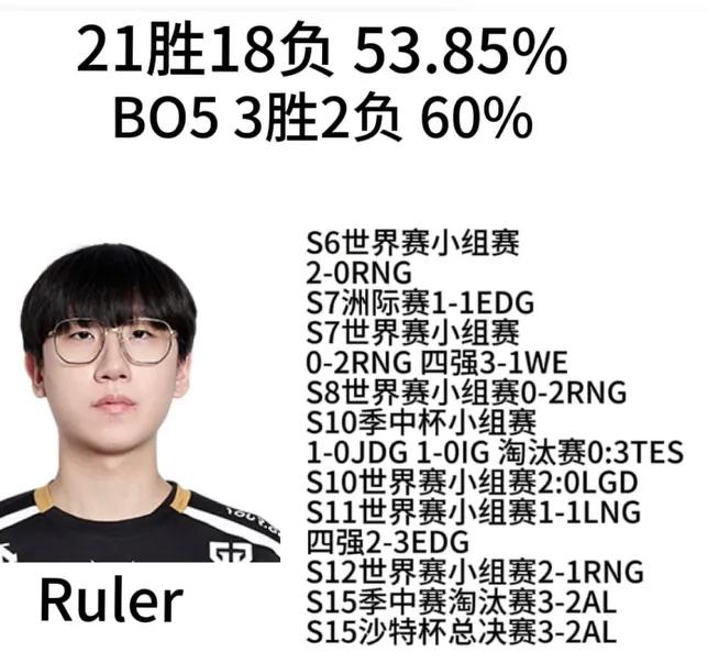 Next is the well-known Chovy, whose overall small-scale win rate is 47.17%, with 25 wins and 28 losses. His BO5 win rate is 62.5%, with five wins and three losses. He only began facing LPL teams after the S9 season, so his match count isn’t very high. Another familiar name, Ruler, also has a limited number of matches, with an overall win rate of 53.85%, 21 wins and 18 losses. He has played five BO5 series with a 60% win rate. Ruler’s limited matches are because he previously competed in the LPL for a while and took a few years off; otherwise, his match count would be higher.