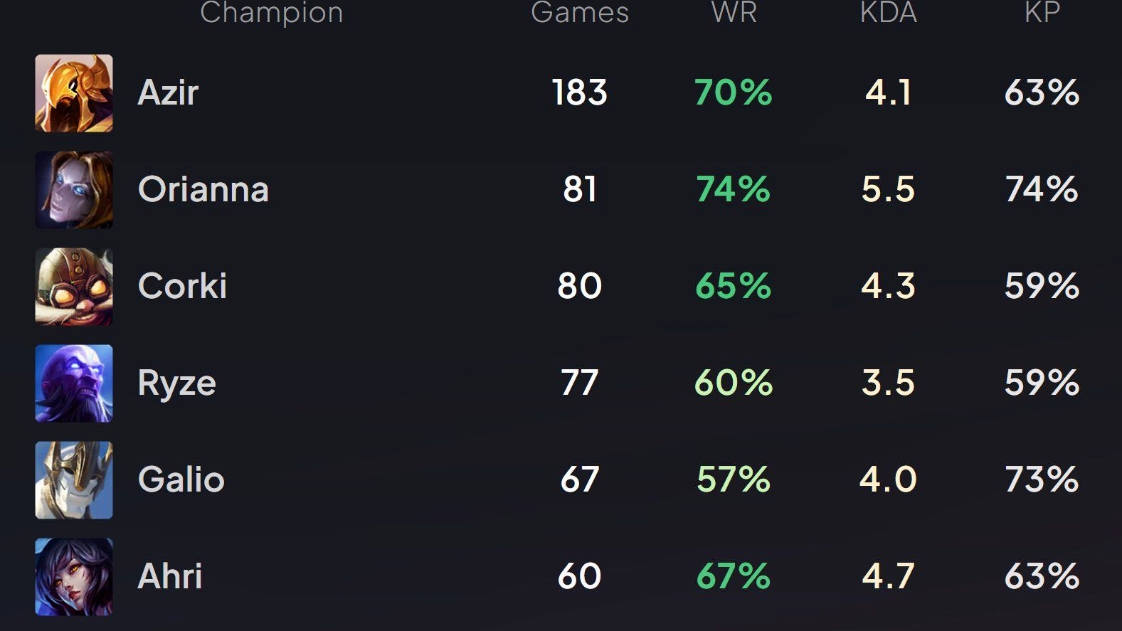 Faker has five champions with over 30 appearances and a win rate of 70% or higher. His highest is LeBlanc with 48 games and a 79% win rate, followed by Lissandra with 39 games and 77%. Next is Orianna with 81 games and 74%, and finally Azir and Viktor, both with a 70% win rate. Azir has been played 183 times, while Viktor only 56. Except for Galio, all other champions have a win rate above 60%.