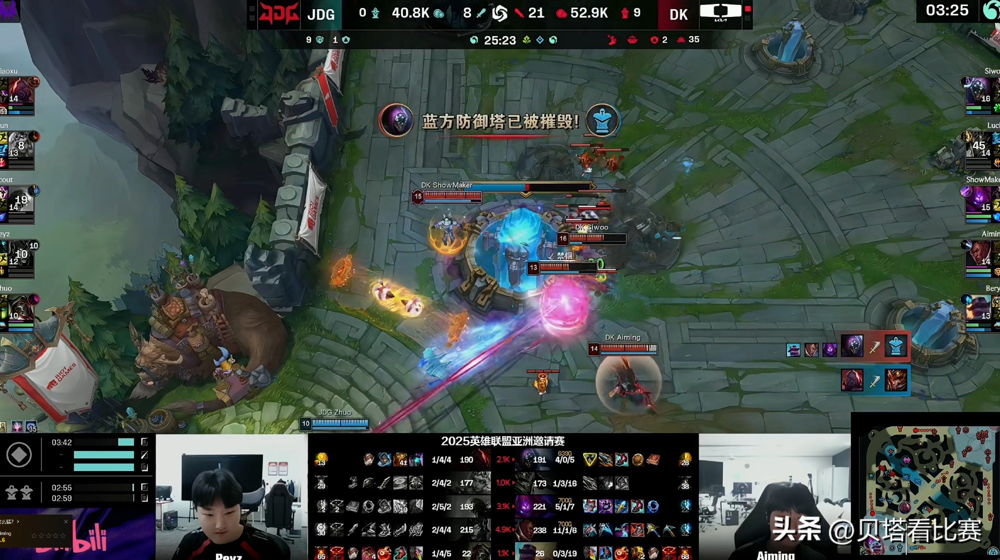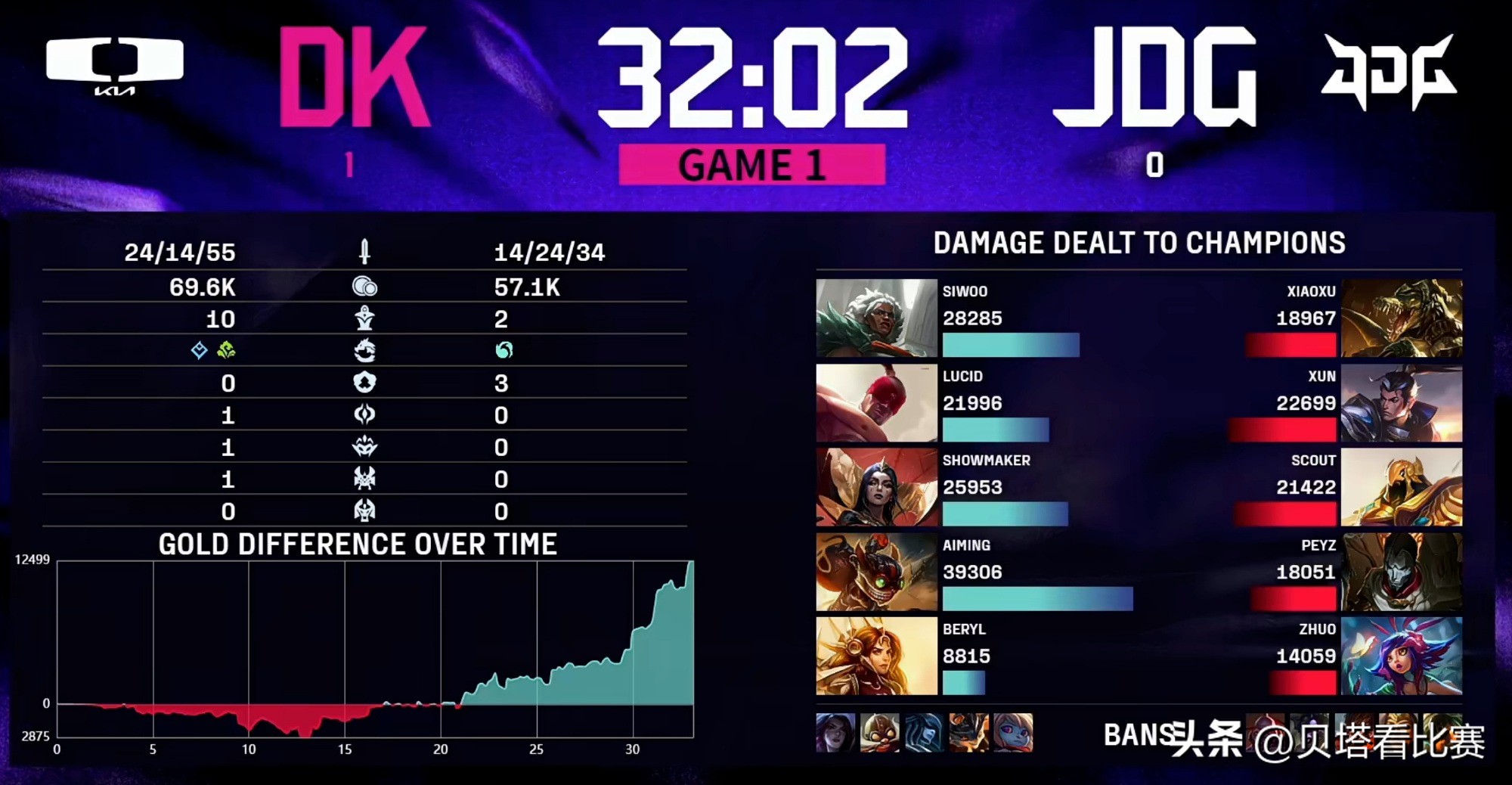 In the mid game, JDG began to make mistakes. At 20 minutes, DK caught and killed JDG’s bot lane duo in the upper jungle and took Baron Nashor. At 28 minutes, DK’s top and jungle stole the Elder Dragon; JDG came to contest, but DK abandoned the dragon and initiated a team fight. Lucid’s Lee Sin played aggressively, and DK exchanged 1 for 4 before securing the Elder Dragon. In the late game at 30 minutes, Lucid’s Lee Sin made chaotic plays in the base, and after a 1-for-5 team wipe against JDG, DK won the first game. The highest damage dealer in the first game was Aiming on Ziggs.