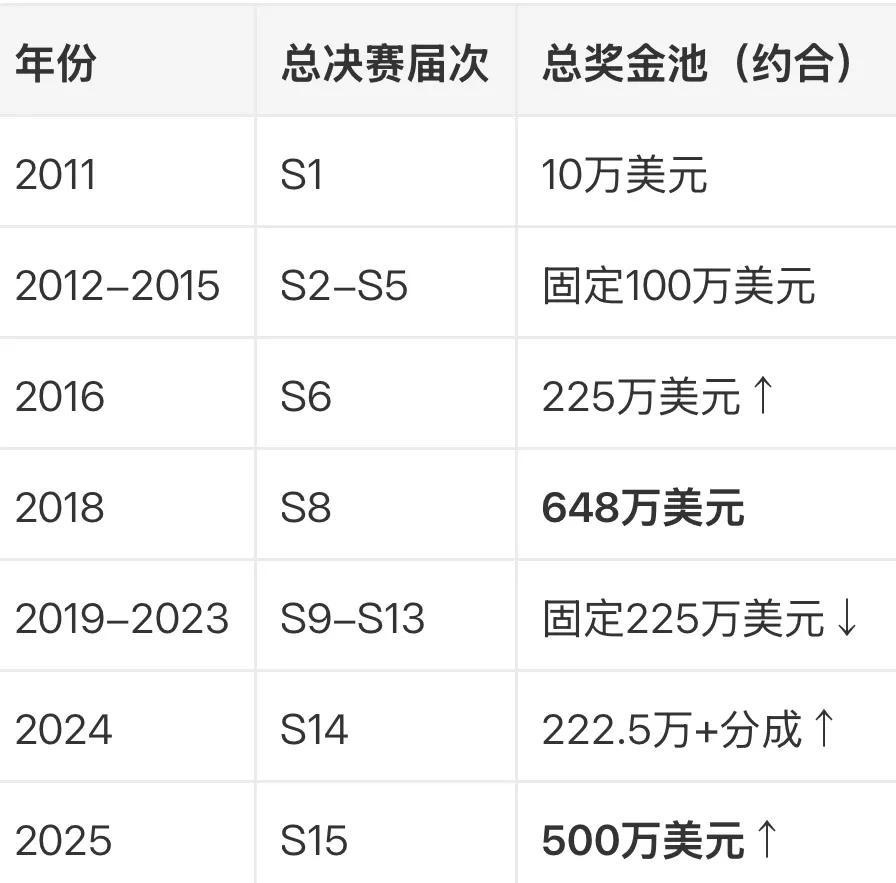 In recent years, League’s popularity has been a hot topic among players. Many feel the game has declined. The prize pool history reflects this: Season 1 had a fixed $100K pool; Seasons 2 to 5 rose to $1 million; Season 6 doubled to $2.25 million. The peak was Season 8, reaching $6.48 million—the same year the LPL won its first World Championship. Starting from Season 9, the prize pool steadily decreased, fixed at $2.25 million, and by Season 14, it was $2.225 million. With various splits, it’s clear the environment wasn’t very favorable.