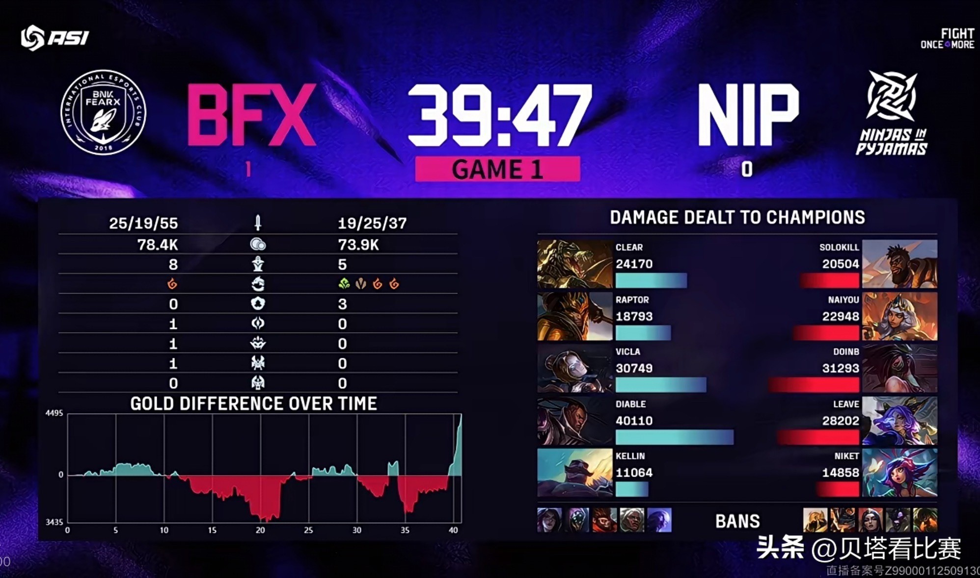 In the mid-game skirmishes, BFX’s Jarvan successfully pulled enemies apart and, with teammates, eliminated Yuumi. BFX then aggressively contested the Rift Herald. doinb’s Akali entered and assassinated FPX’s Jarvan, but Kiana’s mistake allowed FPX to counterattack, turning a 1-for-4 exchange and securing the Rift Herald. At 22 minutes, NIP secured the Dragon Soul. Later at 31 minutes, BFX caught and killed NIP’s top and support in the jungle, then claimed the first Baron. At 33 minutes, both teams fought over the Dragon; Neeko flanked multiple enemies with her ultimate, enabling NIP to score a 0-for-3 trade and claim the Infernal Soul. At 38 minutes, a jungle clash saw Neeko caught out, Yuumi instantly killed, while BFX’s Lucian scored a triple kill and pushed straight to destroy the base. The highest damage dealer in the first game was Diable’s Lucian, while doinb’s Akali led damage for NIP.