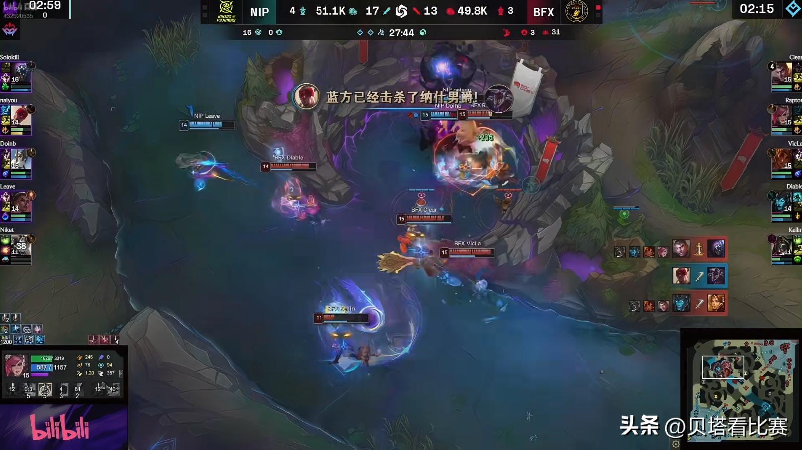 In the first match, BFX’s composition included Renekton top, Jarvan jungle, Orianna mid, and Lucian with Braum bot; NIP had Qiyana top, Kiana jungle, Akali mid, and Yuumi with Neeko bot. During the laning phase, NIP proactively swapped lanes, leaving Yuumi top against Renekton. BFX’s Jarvan flanked and caught Yuumi, securing first blood. Later, doinb’s Akali dove under tower to solo kill BFX’s Lucian but was traded off. Early on, NIP took down the first tower in the bottom lane, gaining a 2K gold lead.