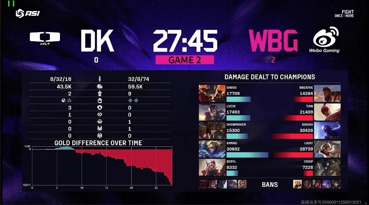 In contrast, WBG handed the LCK their first defeat, with many jokingly calling them "stubborn underdogs" in international play. In the first game, DK played aggressively, trying to trade economy with WBG, but Xiaotian's pace and Liu Qingsong's control perfectly held the situation. Especially at 21 minutes, a forced team fight gave WBG a huge advantage, with two consecutive zero-for-four exchanges, allowing them to take down DK's base by 28 minutes. The second game started poorly for WBG; within four minutes, Xiaotian failed a jungle invade and gave the first blood. The turning point came at 13 minutes when DK dove Xiaotian, but then Xiaohu teleported in with Light to kill four DK members, reversing the situation. The match ended in just 27 minutes.