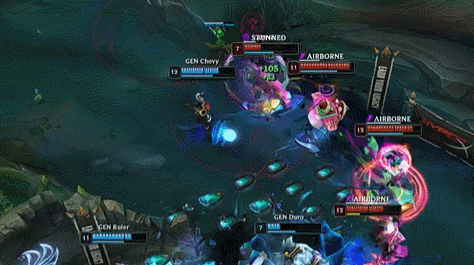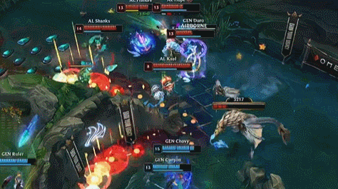 At 12 minutes, AL used their mid-lane push and superior fighting strength to take the second dragon, but then made a critical mistake as mid-jungle tried to tower dive Kled and were collapsed on by GEN, killing Qiyana.