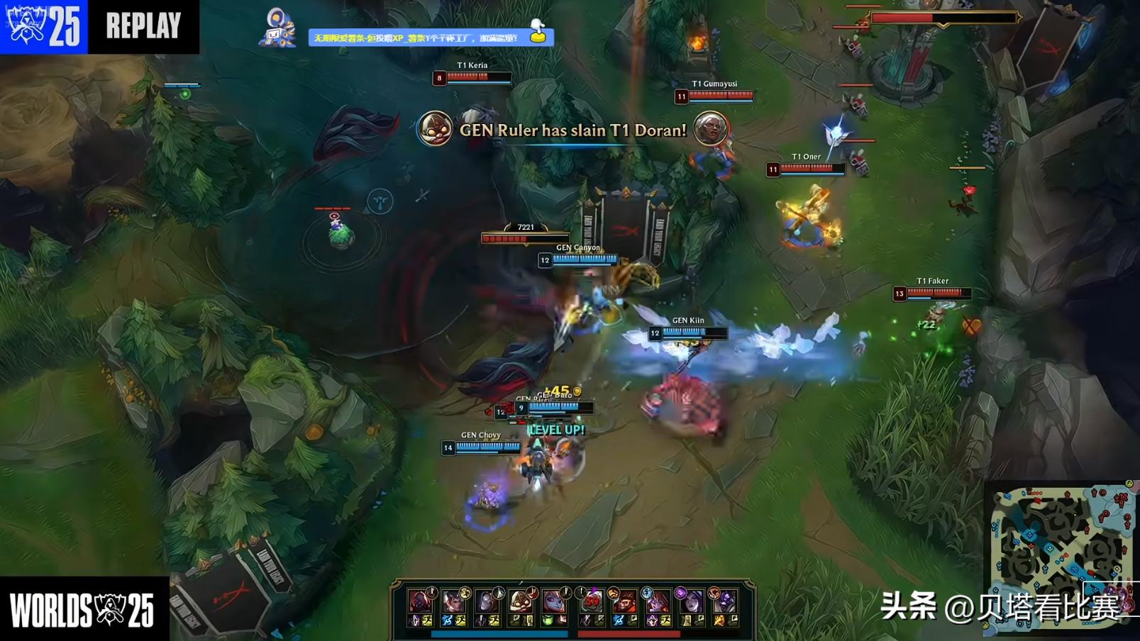 Both teams played cautiously in the early game with no kills occurring. Each side secured one dragon, and GEN took the Rift Herald, keeping the gold even. At 17 minutes, GEN used the Rift Herald to destroy T1’s first mid turret. Then during a dragon contest, Faker’s Aurelion made a misstep and was instantly killed. Although Gumayusi’s Kai'Sa took down Ruler’s Aphelios, T1 lacked damage, and GEN counterattacked with a 1-for-5 team wipe. At 20 minutes, during the Elder Dragon fight, T1 initiated, but Doran’s Anivia ultimate was interrupted, and he was quickly eliminated. GEN then kited and killed three T1 members, securing the Elder Dragon.