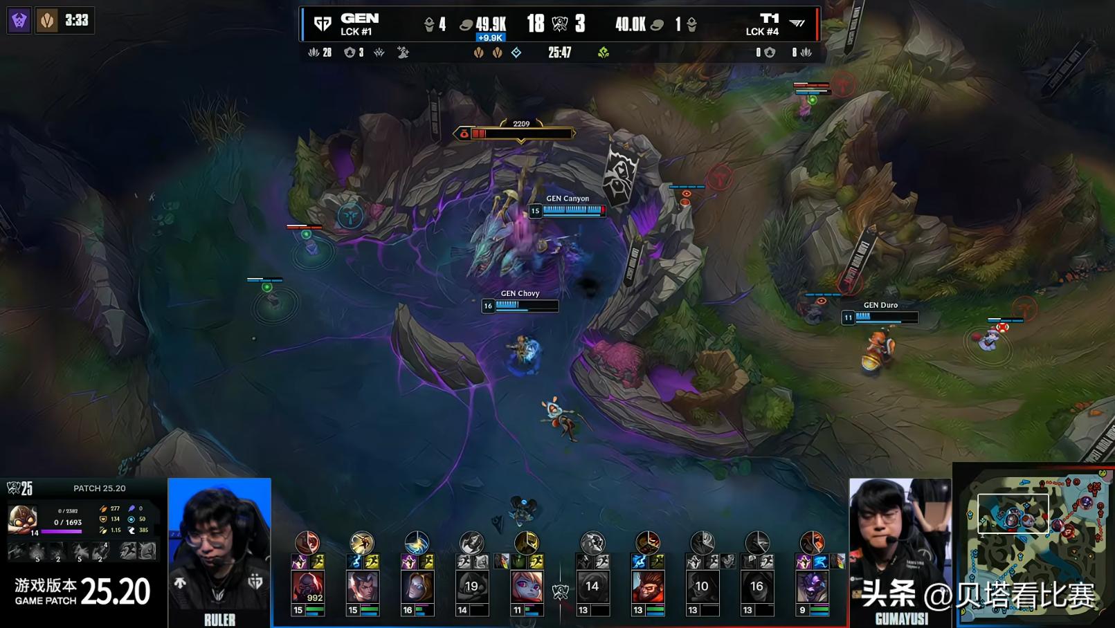 At 22 minutes, GEN initiated a fight mid; Gumayusi’s Kai'Sa was immediately taken down, but GEN chased and wiped T1 again. At 24 minutes, GEN took the dragon without any damage. At 25 minutes, a skirmish broke out in the jungle where Duro’s Poppy knocked Oner’s Wukong away. Despite T1’s desperate efforts to kill Ruler’s Aphelios, Chovy’s Orianna used his Stopwatch to avoid damage and unleashed massive damage, resulting in a 1-for-4 exchange and GEN securing the first Baron.
