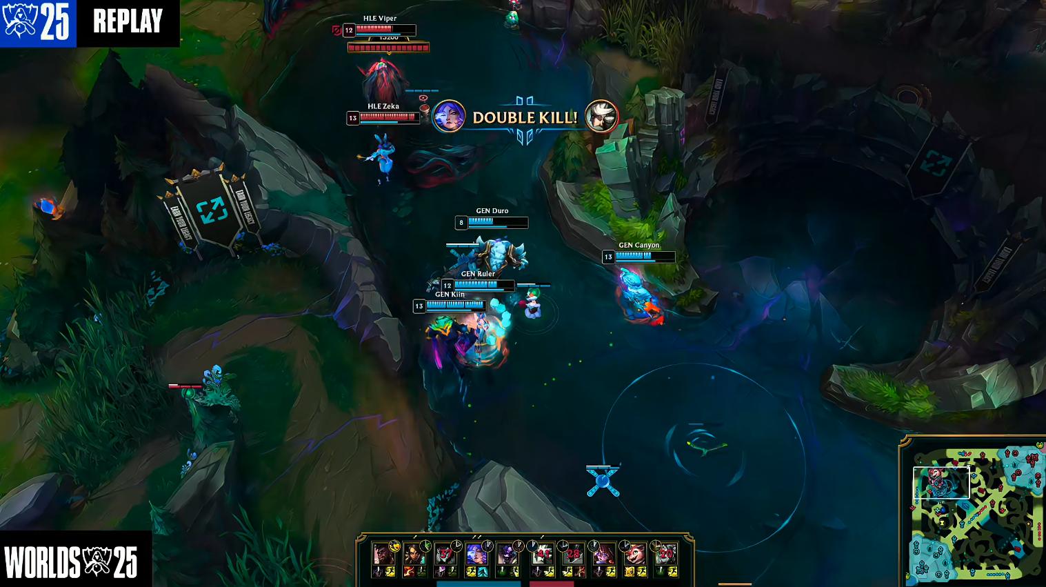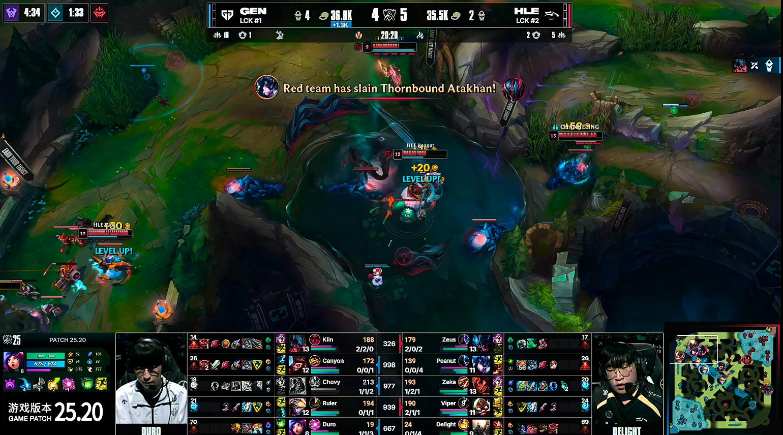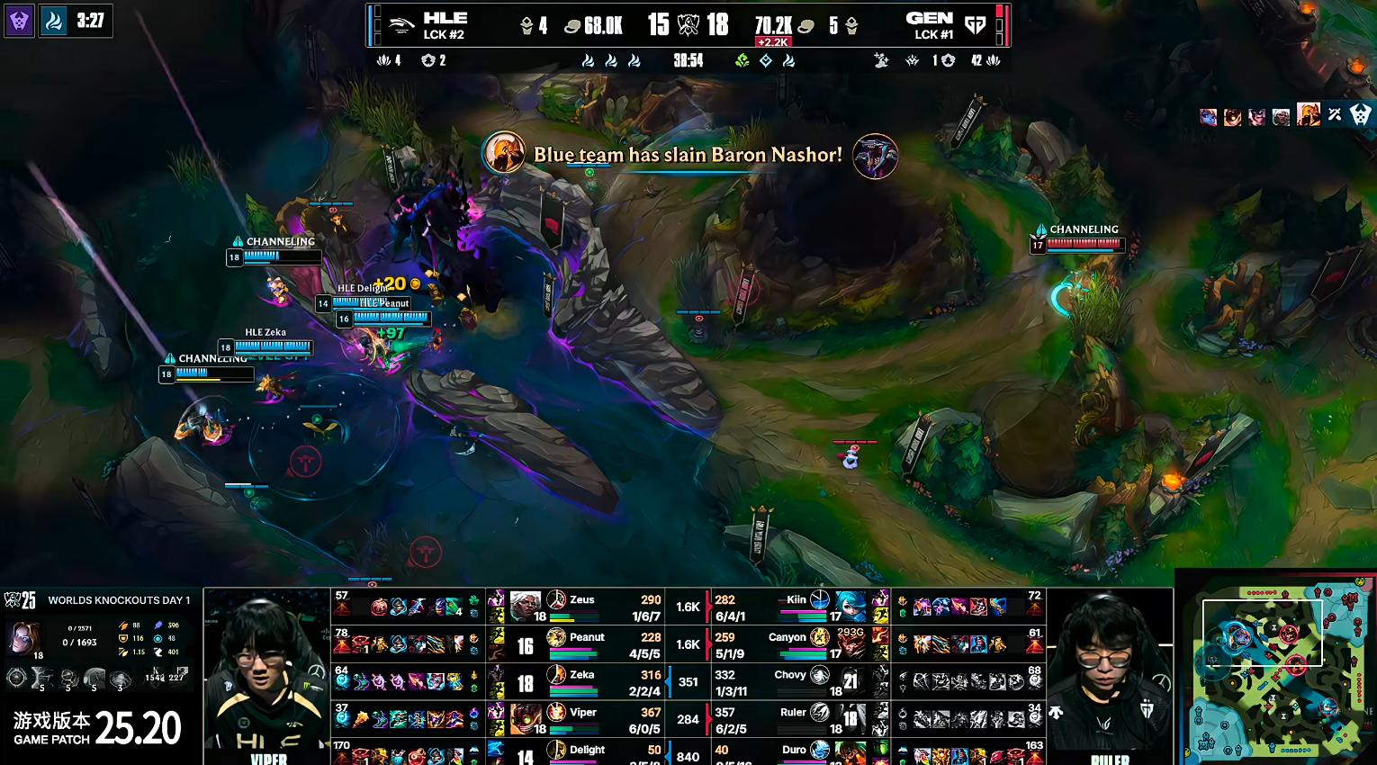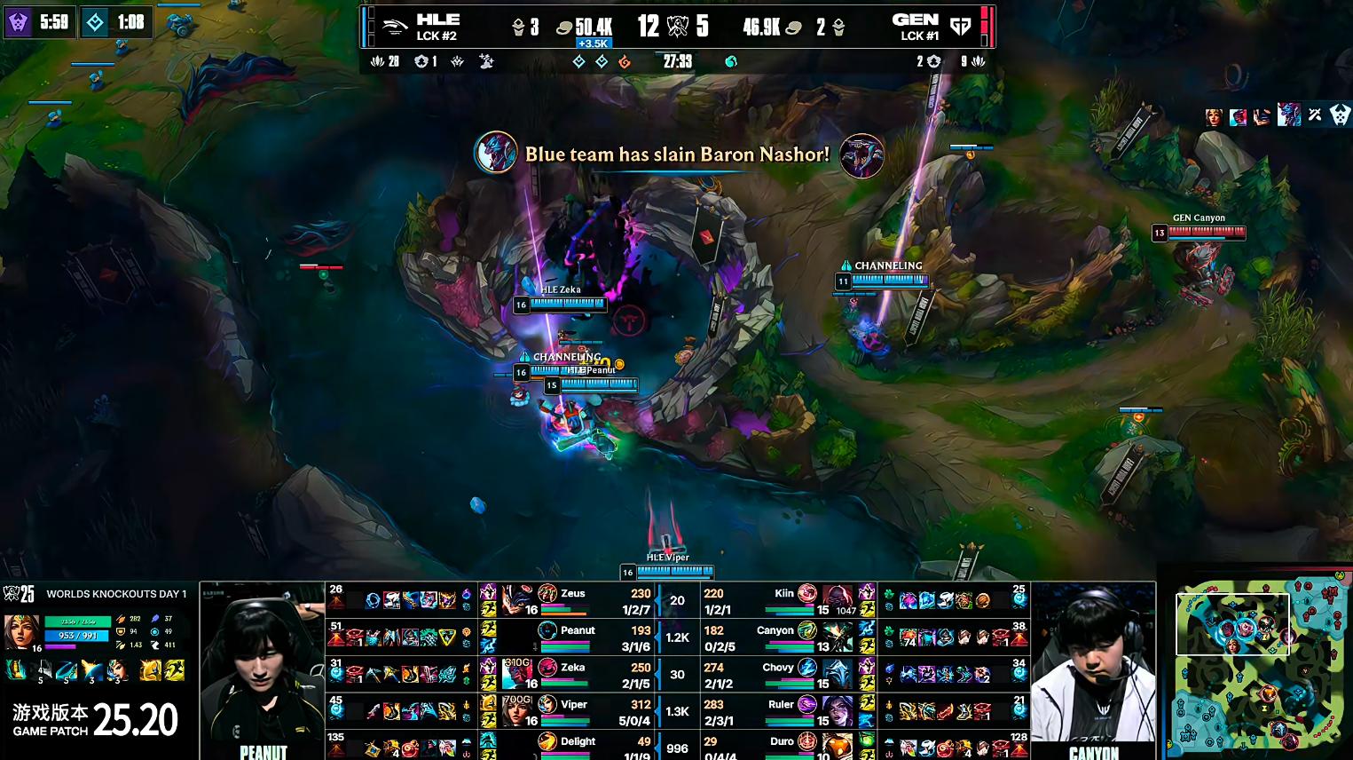 Although GEN secured Baron, they couldn't end the game immediately. When the Elder Dragon respawned, both teams clashed in the decisive fight. GEN had vision control and kept HLE at bay. HLE, unable to safely recall for wards, initiated a fight, but Zeka was hooked and instantly killed. GEN took the Elder Dragon uncontested. The fourth Baron also went to GEN. With double dragon buffs, GEN pushed top lane in one wave, but HLE's four players caught Kiin and killed him just in time to defend. HLE managed to clear GEN's Elder Dragon buff, leading to a lull as both sides awaited the second Elder Dragon.