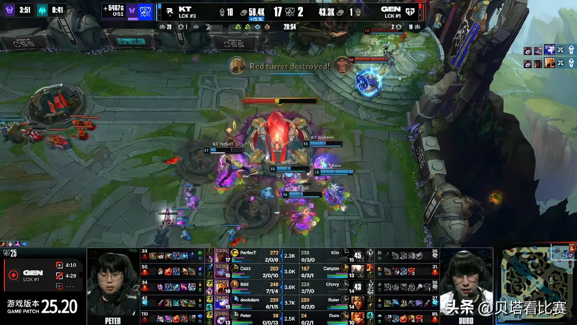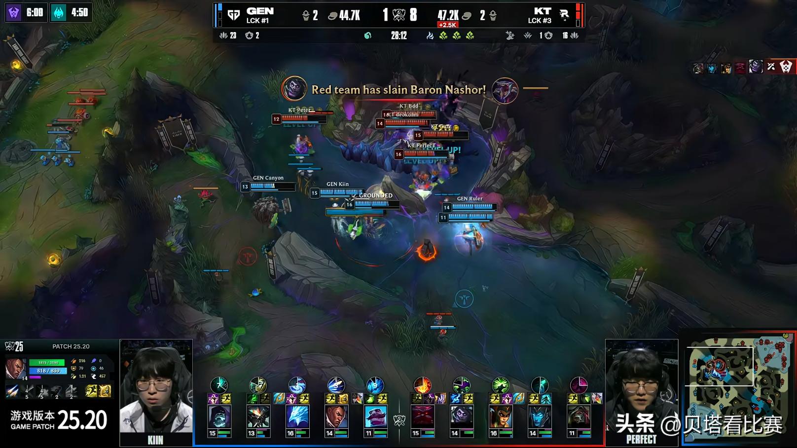 In the mid-game, GEN heavily damaged multiple KT members top and took Baron Nashor. At 27 minutes, a jungle skirmish saw Perfect’s Rumble ultimate misfire, allowing GEN’s dual carries to output perfectly and trade 1-for-4, securing the first dragon. Later at 33 minutes, Cuzz’s Jarvan was caught, and Canyon’s Vi aggressively pushed into the base, but BDD’s Yone counterattacked flawlessly. The teams exchanged 4-for-4 kills, but Cuzz respawned first, enabling KT to claim the Earth Dragon soul. At 37 minutes, while contesting Baron, KT forced GEN away and took it, but Perfect’s Rumble was instantly killed due to poor positioning, and Deokdam’s Caitlyn was trapped by Kiin’s Sion in the pit. GEN traded 2-for-4 and secured the second Baron. However, during GEN’s push, KT’s mid and support initiated and killed Chovy’s Taliyah. At 41 minutes, KT swiftly secured the Elder Dragon, and at 43 minutes, they took the third Baron without damage. Finally, at 46 minutes, KT pushed into the base and clinched the first game. The highest damage dealer was Deokdam’s Caitlyn.