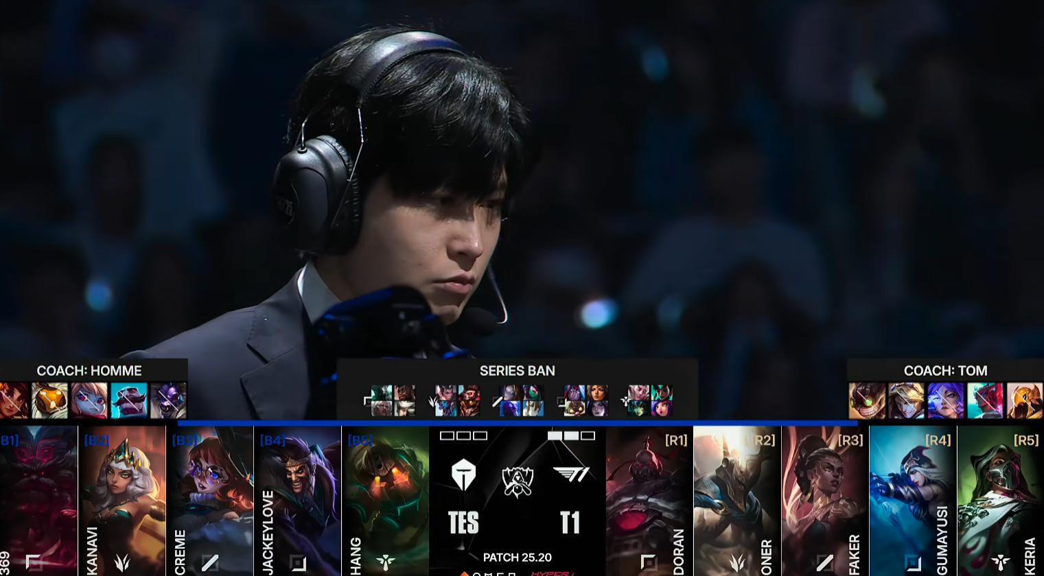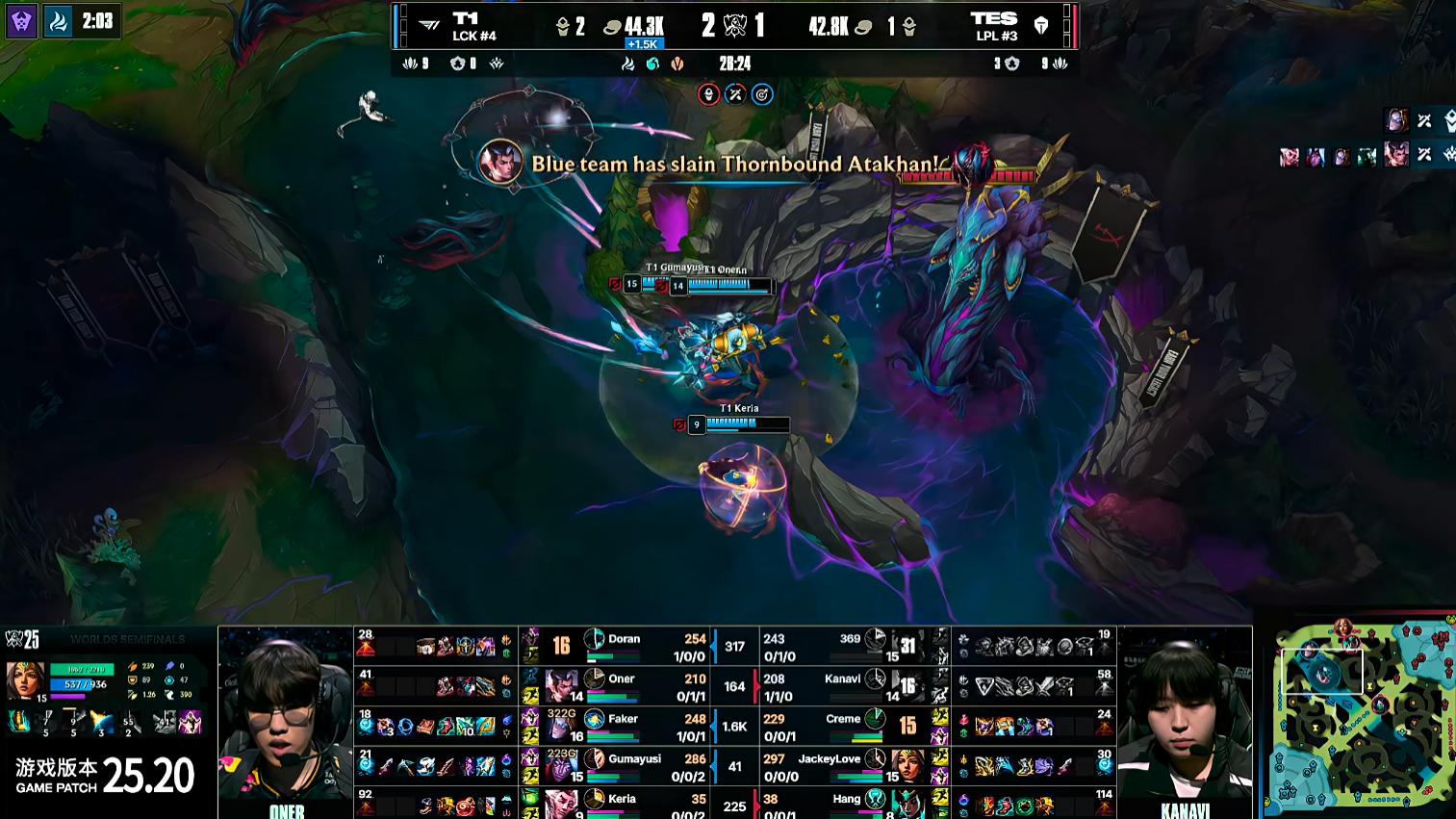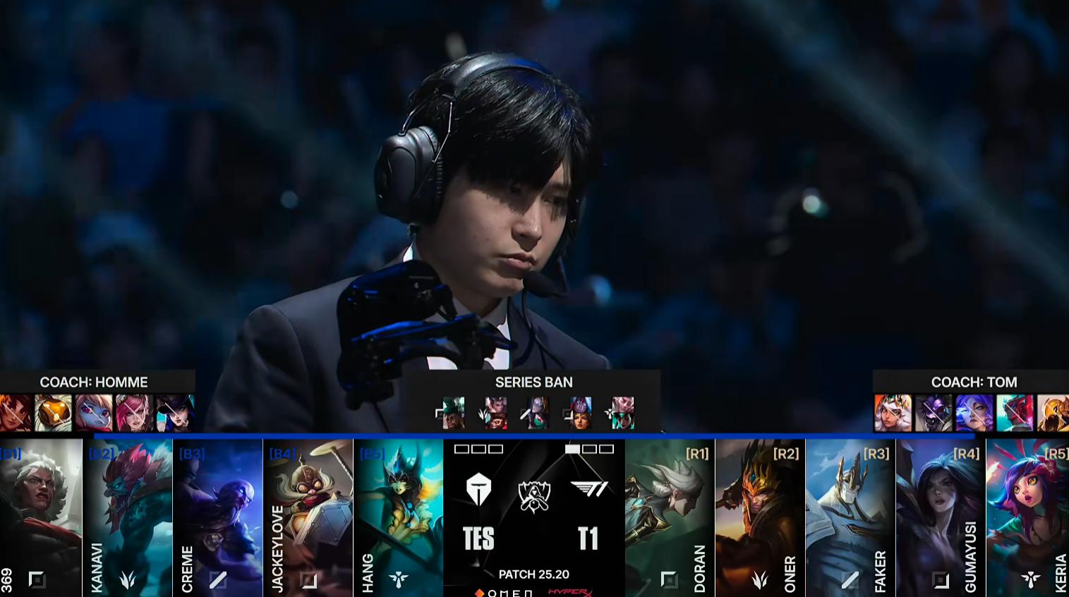 T1 then settled into a familiar strategic rhythm, controlling two consecutive dragons and the Rift Herald. TES repeatedly tried to break through the side lanes, but Faker’s tankiness prevented any openings. At 23 minutes, T1 secured another dragon to reach match point. At 25 minutes, TES initiated on Elder Dragon, but T1’s team defense killed Kanavi, causing TES to collapse. T1 claimed Elder Dragon and the Baron afterward.