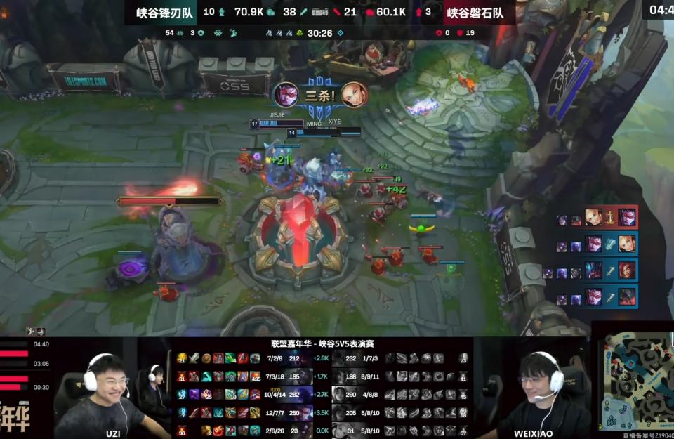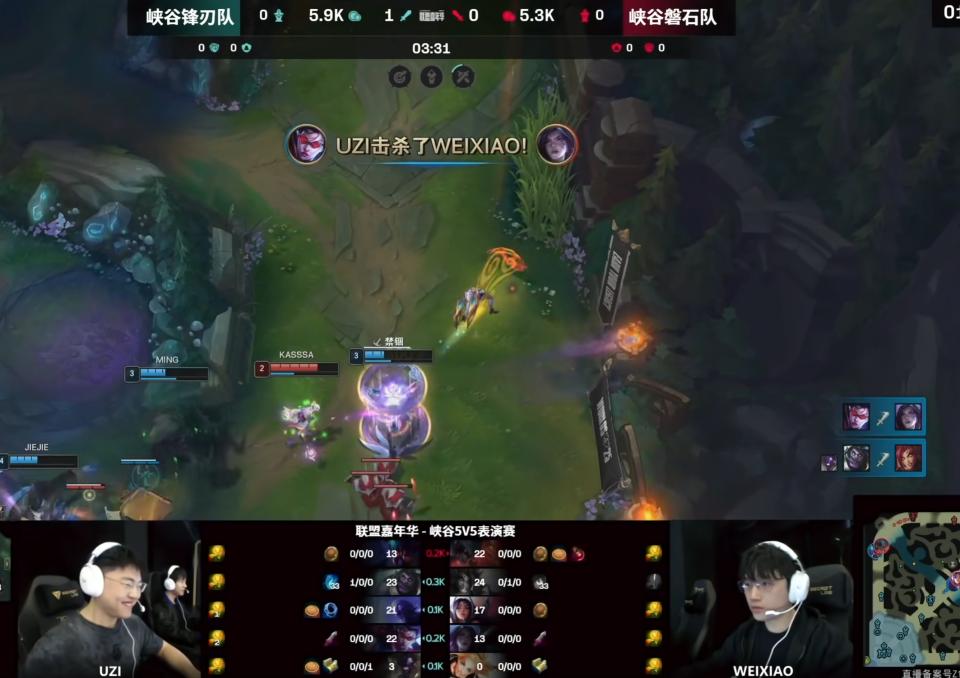 On Uzi’s side, his partner was support Ming, his favorite and most comfortable support pick. The mid-jungle duo was Xiye and Jiejie, with Long in the top lane. Doinb’s lineup included Langx at top, Zzr as jungler, Weixiao and Kasssa in the bot lane, and of course, Golden Gugu in mid. This sparring match featured many exciting moments, especially with Uzi bringing out his signature champion Vayne, while Weixiao picked Uzi’s other iconic champion, Kai'Sa, who is also a Hall of Fame hero! The teams exchanged blows in a lively contest, providing an entertaining match for everyone. However, in this current meta, junglers are crucial. Jiejie’s resource control and jungle dominance completely suppressed Zzr, leaving little suspense in the game!