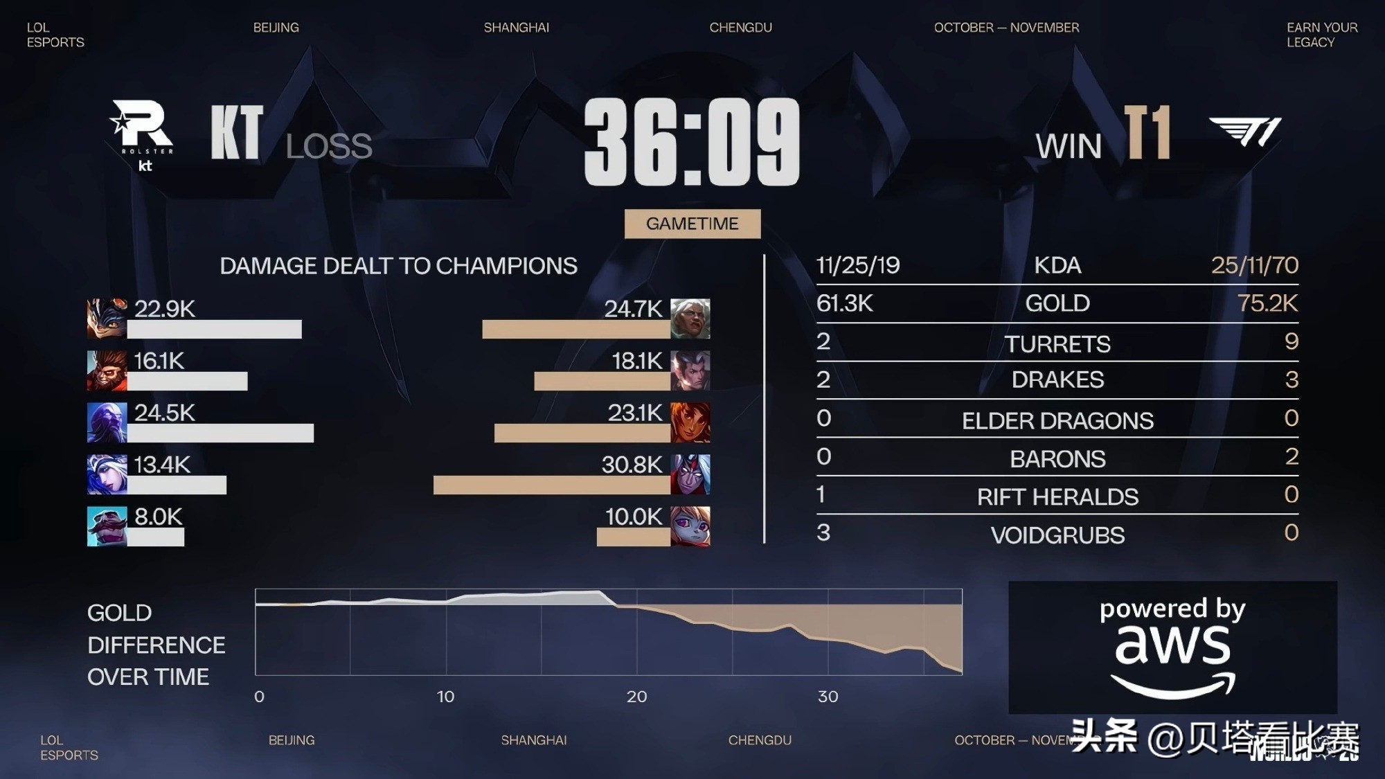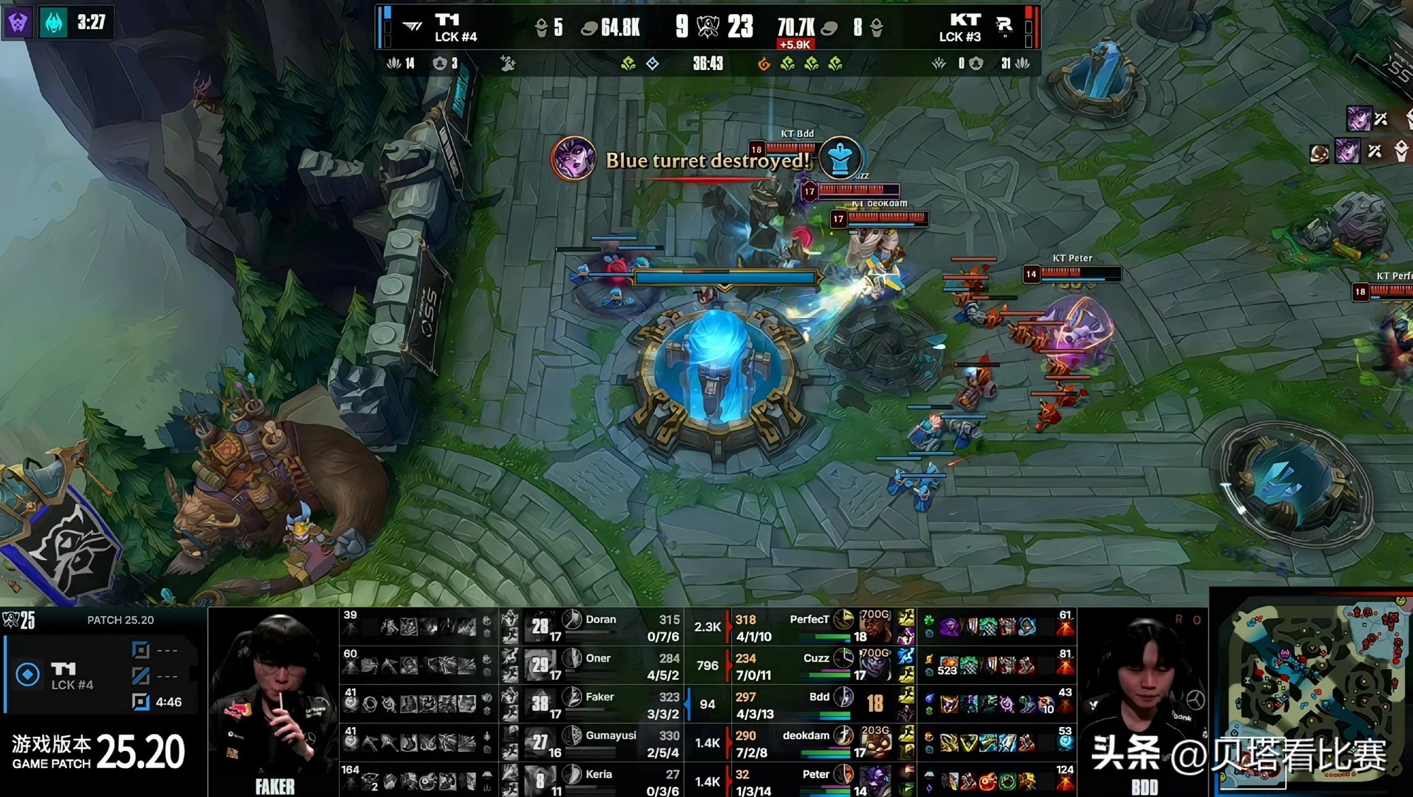 In the first game, KT’s roster included Rumble top, Wukong jungle, Ryze mid, and Ashe plus Braum bot; T1 had Aphelios top, Xin Zhao jungle, Taliyah mid, and Varus with Poppy bot. During the laning phase, KT gained momentum, securing kills on Xin Zhao in the river, with BDD’s Ryze grabbing first blood. Subsequently, T1’s bot lane made a mistake, allowing KT to trade one for two. KT’s top and jungle support responded quickly to secure a zero-for-two exchange. Early on, KT destroyed the first tower on the top lane, claimed two dragons, and led economically by 2K gold.
