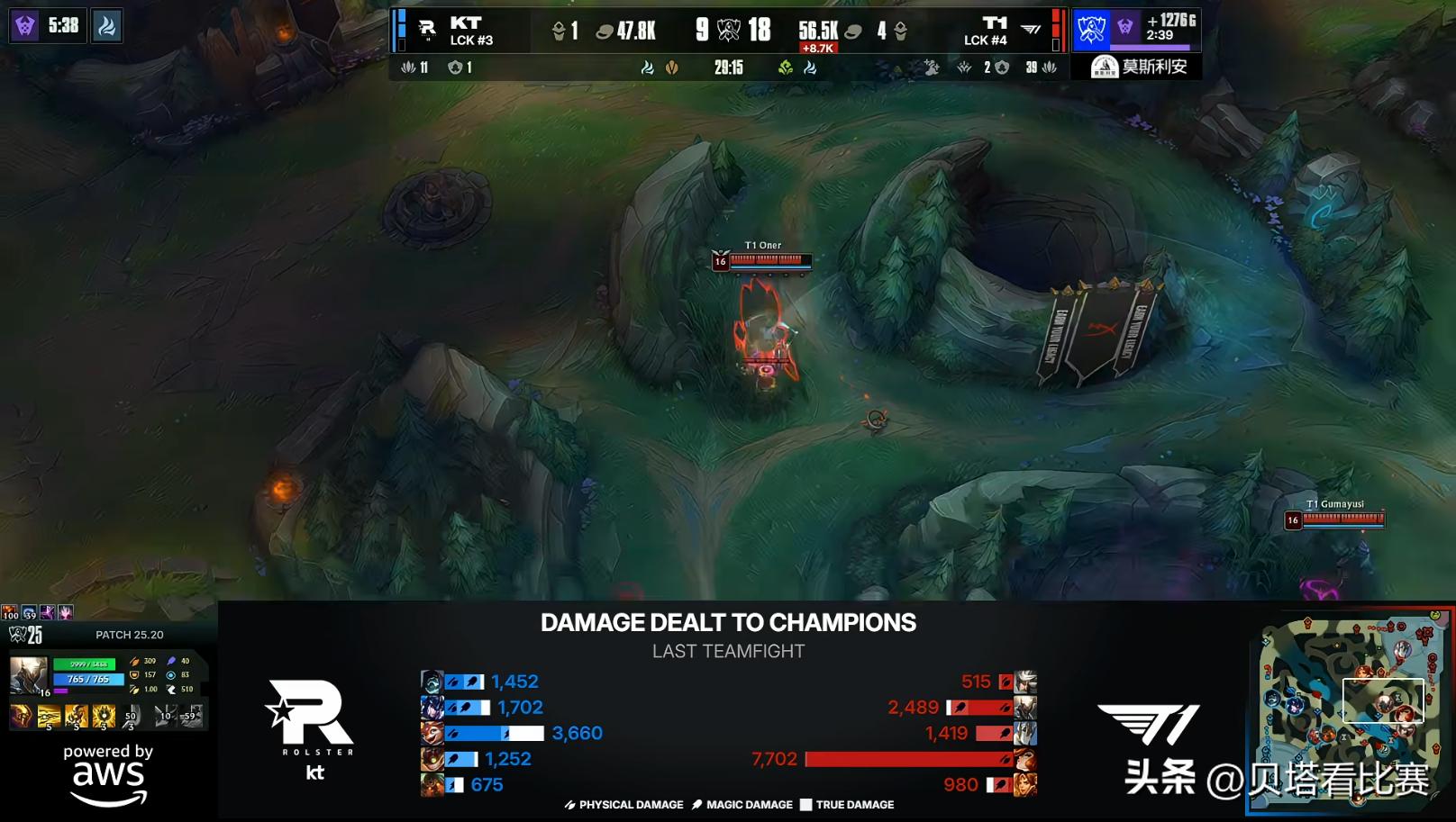In the mid-game, both teams contested the Rift Herald. Doran’s Aphelios aggressively targeted Deokdam’s Ashe, and after T1 secured a two-for-none trade, they pulled back to contest the Rift Herald. KT’s other members tried to intervene but were wiped out by T1, who successfully secured the Rift Herald. At 28 minutes, a mid-lane skirmish broke out: although Oner’s Xin Zhao was instantly eliminated initiating the fight, BDD’s Ryze was chased down by Keria’s Poppy. T1 turned the fight into a one-for-three exchange and claimed the first Baron. Later at 35 minutes, T1 took the second Baron. Doran’s Aphelios initiated a fight again, Deokdam’s Ashe was quickly taken down, and T1 executed a clean zero-for-four team fight to win the second game. Gumayusi’s Varus dealt the highest damage in the first game.