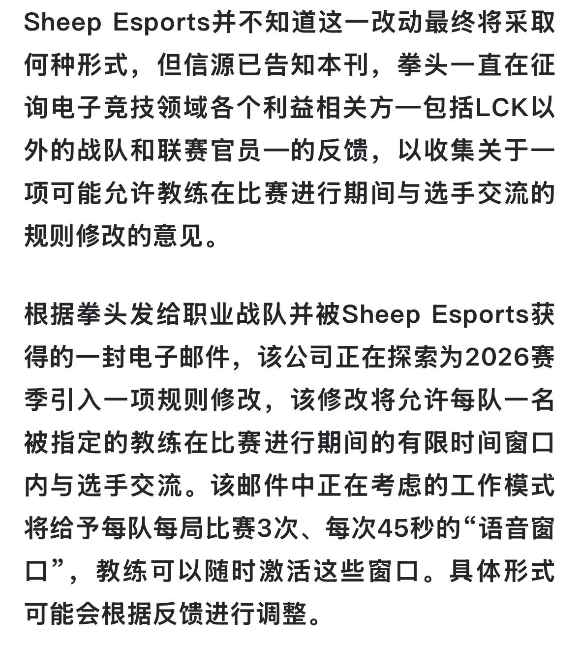 As the offseason progresses, various details about the S16 season have been gradually revealed. First, a foreign leak stated that Riot Games will introduce a rule change in S16 allowing each designated coach a limited time window to communicate with players during matches. Currently, the system grants each team three voice windows per game, each lasting 45 seconds. Coaches can activate these at any time, meaning they can enter and talk to players during the match. If this is true, the selected coach might need a separate room with player-perspective screens; otherwise, with a full-screen view, they would have access to all information.