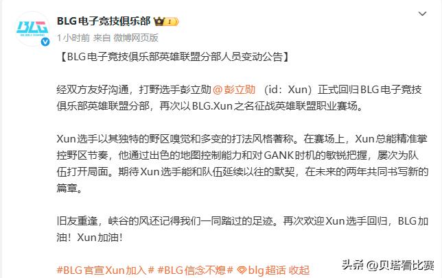 First came the announcement of xun’s return. BLG’s official statement declared xun’s formal comeback to compete again in the LPL with BLG. They praised his playstyle and jungle control, acknowledged his past contributions to the team, and expressed hopes to maintain their synergy and write new chapters together over the next two years.
