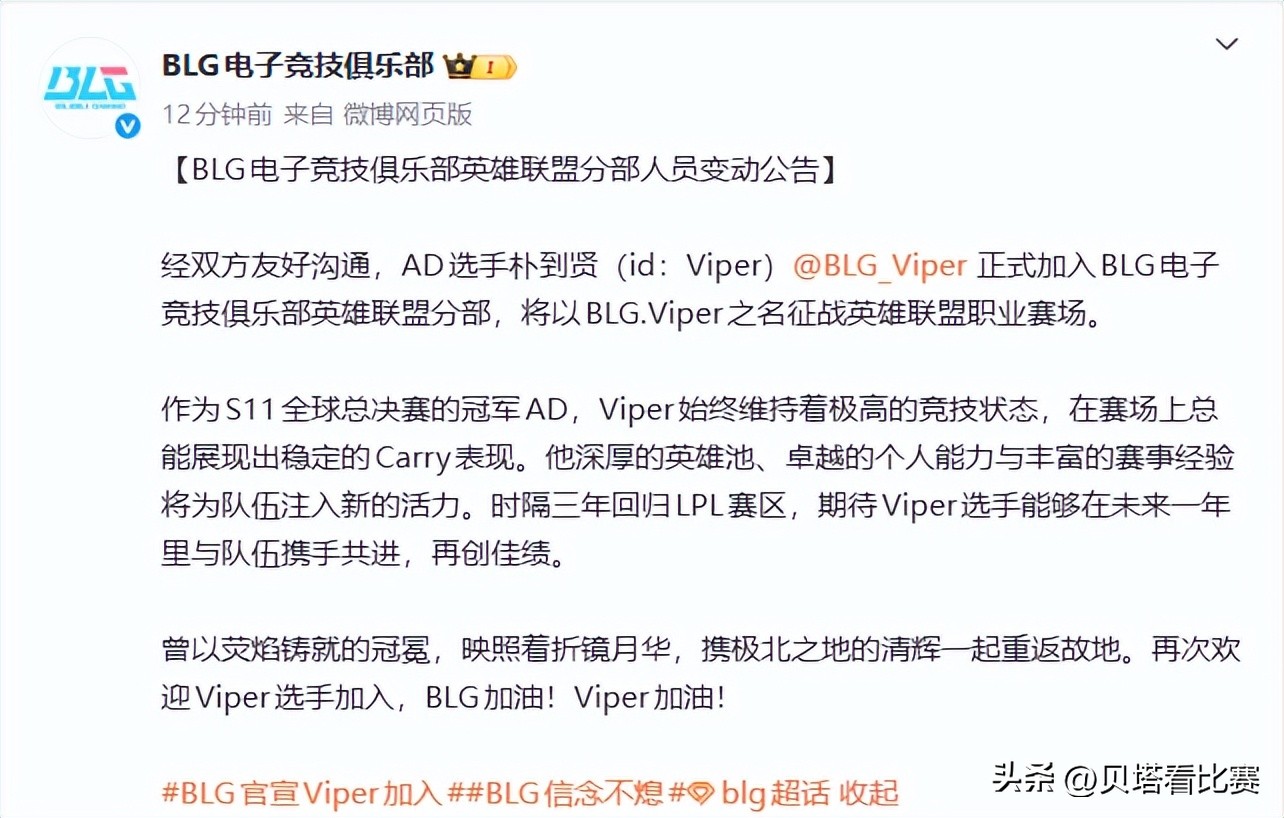 Without pause, BLG then announced the biggest news of this transfer period: Viper’s return to the LPL by joining BLG. The official statement confirmed Viper’s signing and participation in the LPL with BLG. BLG’s official account also reviewed Viper’s achievements, recognized his current form and performance on stage, and expressed anticipation that after three years away, Viper will create new successes in the coming year.