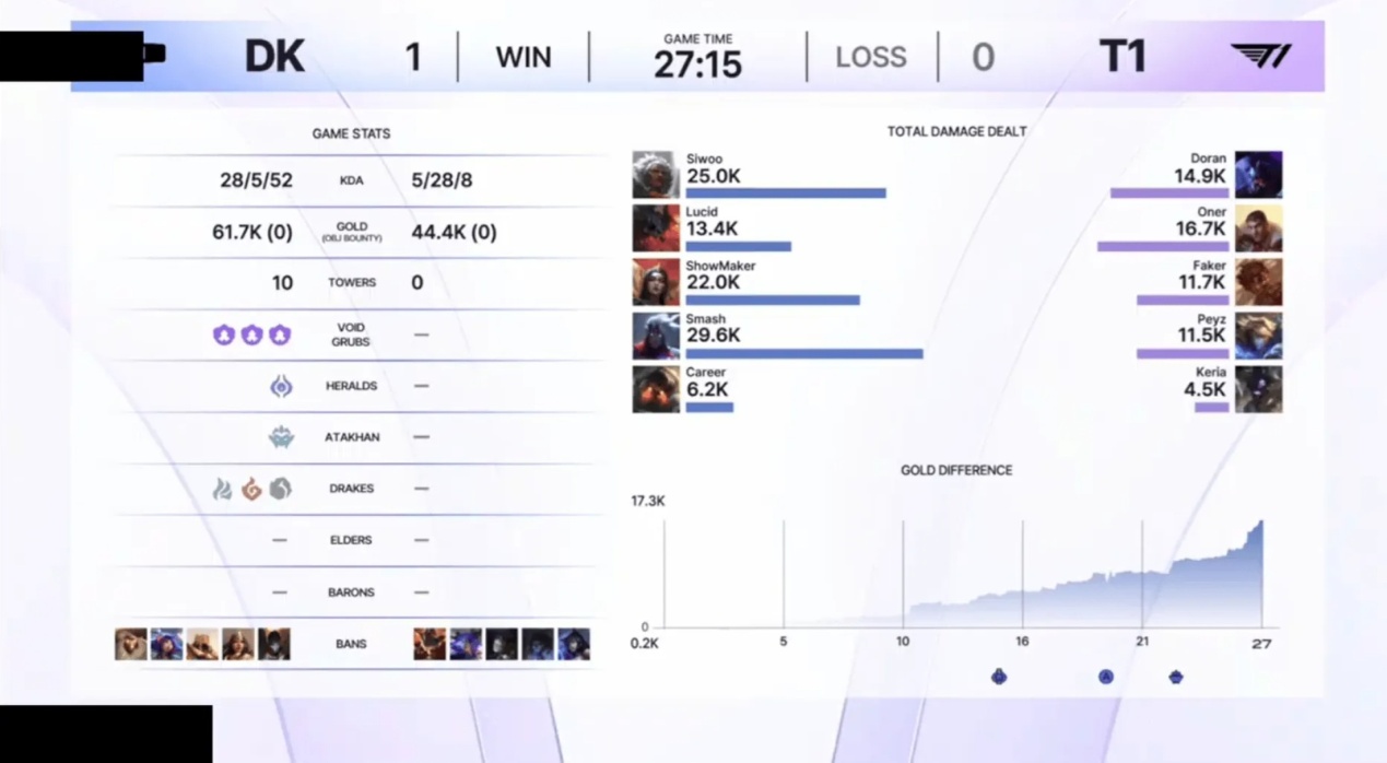 DK closed out the match in just 26 minutes, with Peyz underperforming and being suppressed by T1’s bottom lane player Smash.
