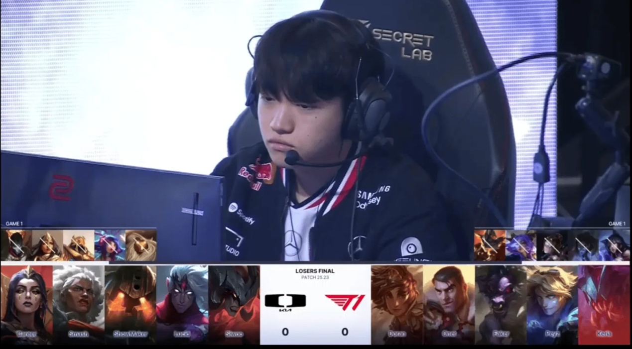 T1’s performance in this BO5 was quite off from the start. In game one, Faker made a major mistake by not buying the Tear of the Goddess, then was solo killed twice by ShowMaker’s LeBlanc. DK dominated the pace, with a top lane attack yielding a 3-for-0 exchange, and by 20 minutes they secured a team wipe at the dragon pit.