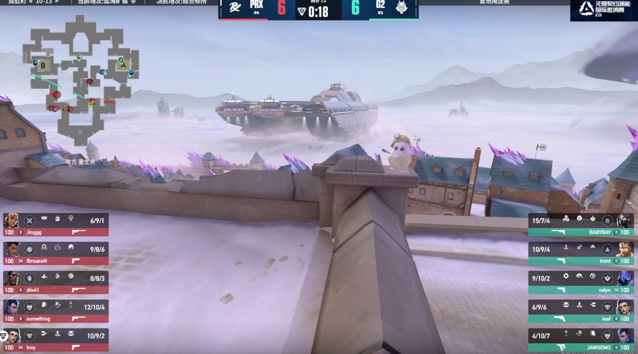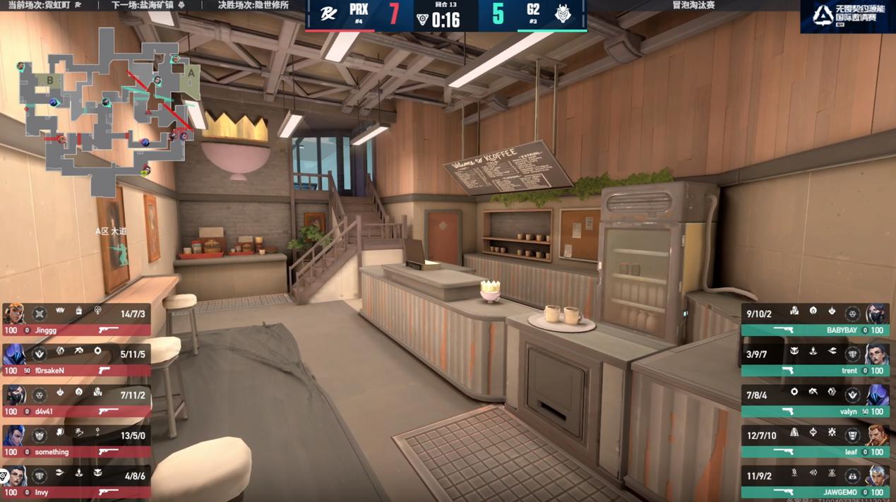 At the start of the first half, PRX lacked rhythm and G2 scored four consecutive rounds. In round 3, babybay exploded with a four-kill to win PRX’s rifle round. In round 6, something cut off G2’s mid rotation, nearly scoring an ACE with four kills, ending PRX’s five-round losing streak and earning their first point. In round 7, something held firm at A site, taking three kills, followed by a kill from a teammate; together they eliminated all five G2 players. PRX then won five rounds in a row. In round 11, babybay used his individual skill to win the fight inside B site’s smoke, defeating PRX’s retake attempt. The first half ended tied at 6-6.