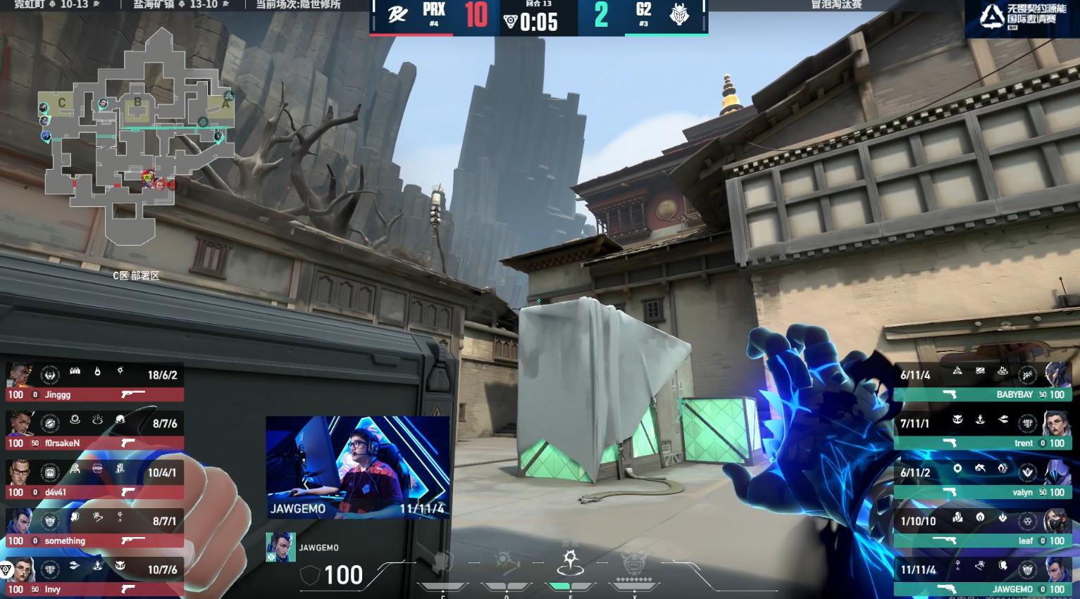 During the first half, Jinggg’s clutch play in the second round saved the team and sparked a comeback against G2. PRX started strong with three consecutive wins. In round 4, G2 made a powerful push with a swarm attack; JAWGEMO’s swarm eliminated Jinggg’s Raze ultimate, enabling G2 to overturn the disadvantage despite weaker weapons. G2 then took four straight rounds, benefiting greatly from their ultimate abilities and aggressive offense. Under the pressure of KAY/O and Brimstone’s ultimates, PRX struggled to hold off G2’s attacks. In round 8, JAWGEMO rushed A site, taking down three PRX defenders alone. In round 10, something executed textbook defensive rotations to stabilize the score. After a timeout, PRX regained momentum and won four rounds in a row. The first half ended with PRX leading 7-5 over G2.