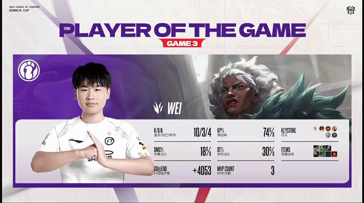 In the fourth game, TES had a strong early lead, with Caitlyn starting 2-0 at six minutes. Yet in team fights, IG overwhelmed them again. Despite TES having more kills, their economy lagged behind. During the team fight phase, TES kept making mistakes, and after only 27 minutes, their Nexus was destroyed. Overall, IG’s top, jungle, and support outperformed their counterparts. Wei’s Volibear and Pantheon stood out, earning him two MVPs in the three wins.