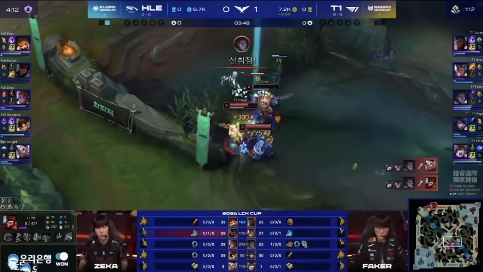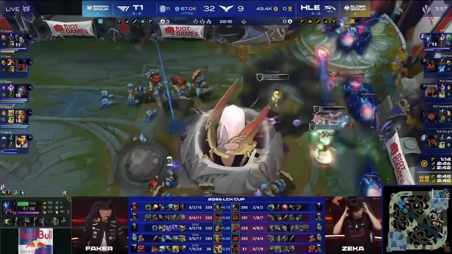 Early on, Oner secured mid-lane advantages, and T1 kept winning team fights. By 15 minutes, they led by 4.4k gold. Doran’s Akali cleaned up in fights, and by 20 minutes, T1 began pushing high ground aggressively. The match ended at 28 minutes with a staggering kill score of 32:9. HLE never took down a single T1 tower, only managed one dragon, and were essentially steamrolled without any chance to fight back.