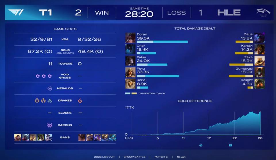 Last year it was Zeus, this year it's Gumayusi—another reunion of old friends! However, this time T1 came out on top. Faker, who seemed to enter “blind mode” at crucial moments, was absolutely terrifying. Faker’s blind Lee is truly an unsolvable challenge, an insurmountable mountain. Despite many changes around him, he still leads the team to victory! To sum up this BO3 in two sentences: HLE struggled to win the first game, then lost the second and third decisively! Ultimately, T1 came back from behind to secure the season opener win, with Faker earning POG honors—especially for his outstanding Sylas in game two and Orianna in game three!