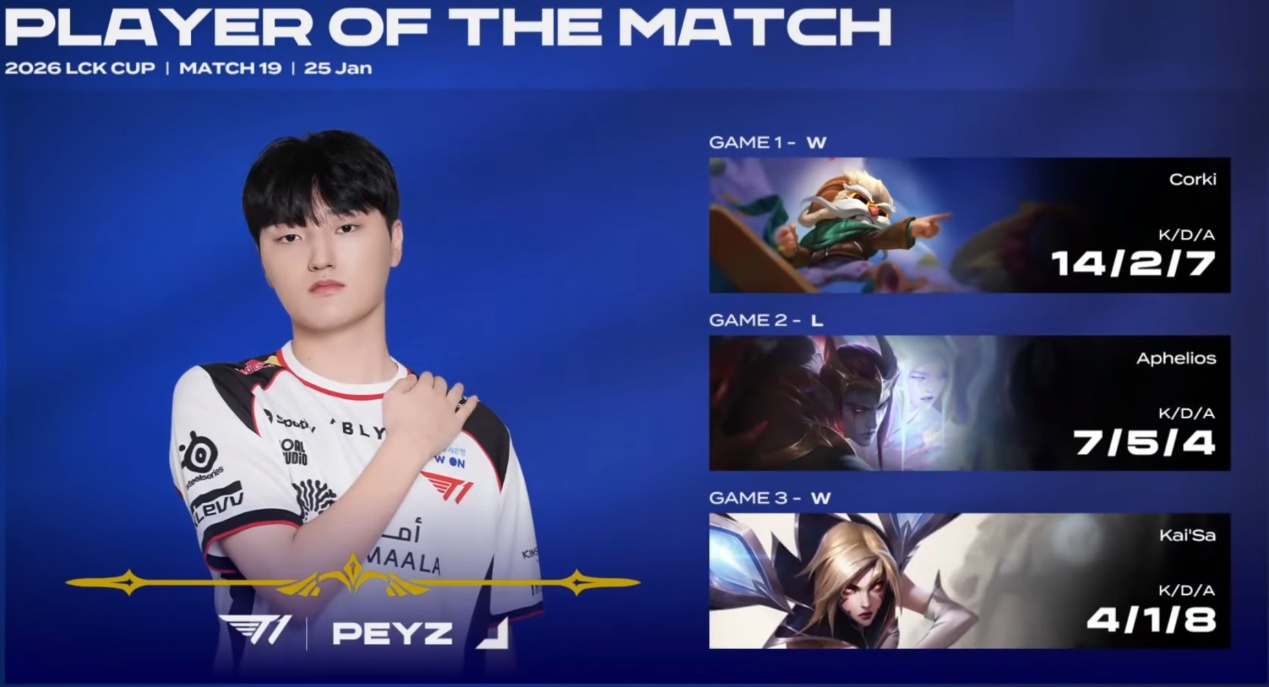 In the final game, Oner’s Pantheon transformed into a battle god, dealing massive damage that BFX couldn’t handle. At one point, Oner was chasing three opponents alone. Peyz’s Kai'Sa was also in top form. With teammates performing excellently, Peyz earned the Player of the Match award, which is great news for T1.