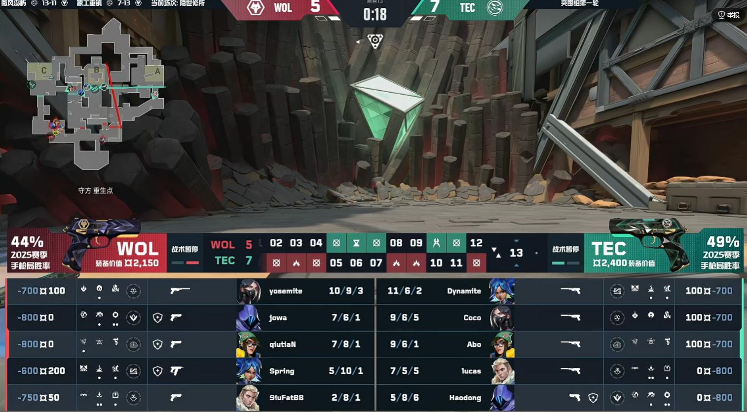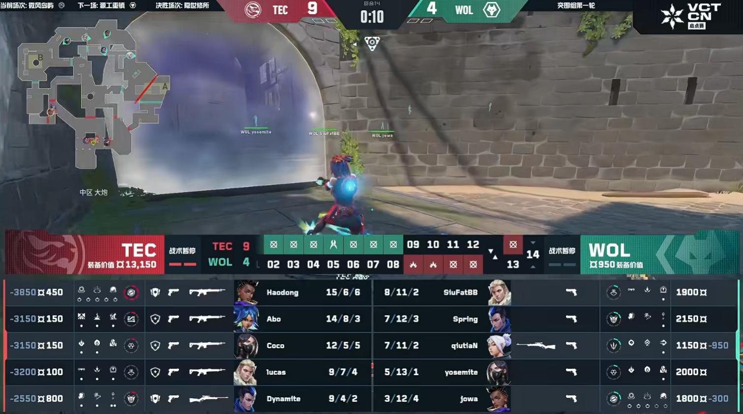 TEC gained momentum; in round 8, they capitalized on WOL’s weaker weapons to hold B site, forcing WOL to call their first timeout. After adjustments in round 9, WOL baited with Qiutian in mid and quietly took B site.