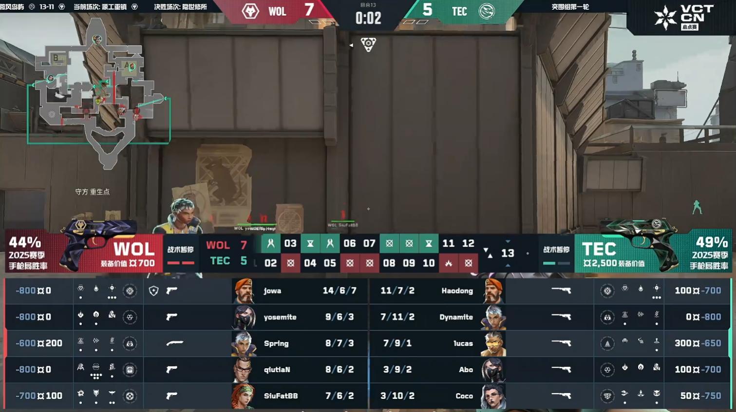 WOL secured three straight rounds. In round 8, TEC rushed A site, killing three WOL players and planting the spike with full gunline coverage. WOL’s jowa and Qiutian saved their weapons.