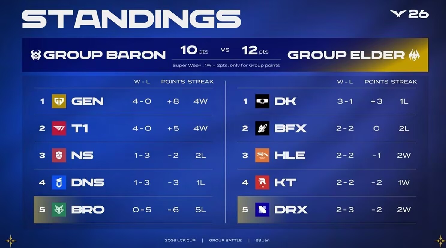 In the first split of the LCK, the Super Week matches have officially started. On the last match day, the two lowest-ranked teams from the Ancient Dragon Group and Dragon Group, DRX and BRO, competed in a BO5 series. Despite being a clash of underdogs, DRX’s general skill level was a bit higher than BRO’s. The teams battled intensely through five games, with the final one lasting 43 minutes, where DRX emerged victorious, earning the Ancient Dragon Group a positive kickoff for Super Week.