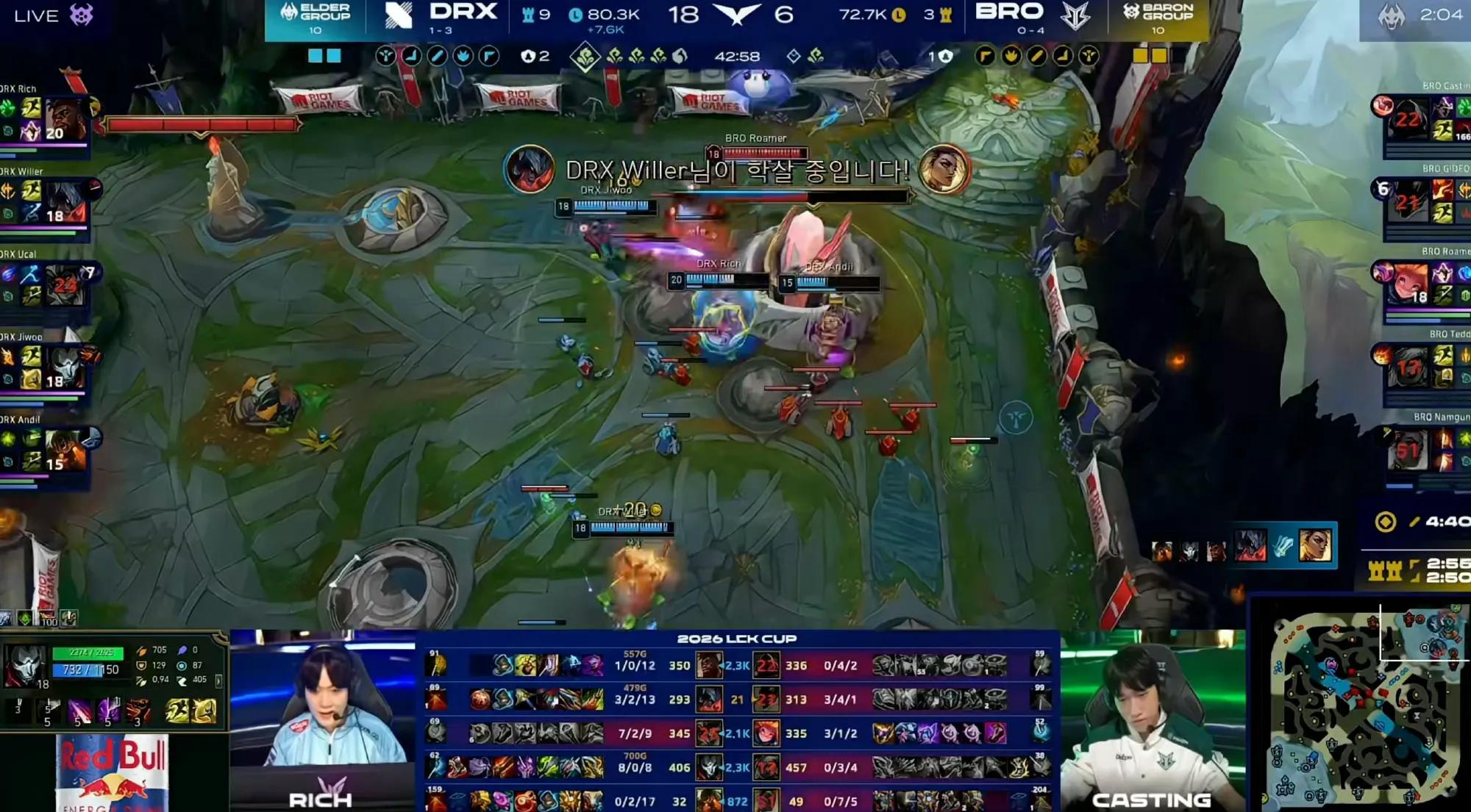 In the first round, DRX from the Ancient Dragon team defeated BRO from the Great Dragon team 3-2, taking the first two points. Previously, both teams were tied at 10-10 in points, making these five games critical—whichever team wins three matches will be the ultimate winner’s bracket team. BRO’s overall performance has fluctuated significantly. Their mid-laner, the once very popular Korean server AI, shows decent mechanical skills in mid-lane fights, but there remains a gap compared to top-tier teams. The main weakness lies in their AD carry and jungler, especially AD carry Teddy, whose performance has been consistently poor in every match.